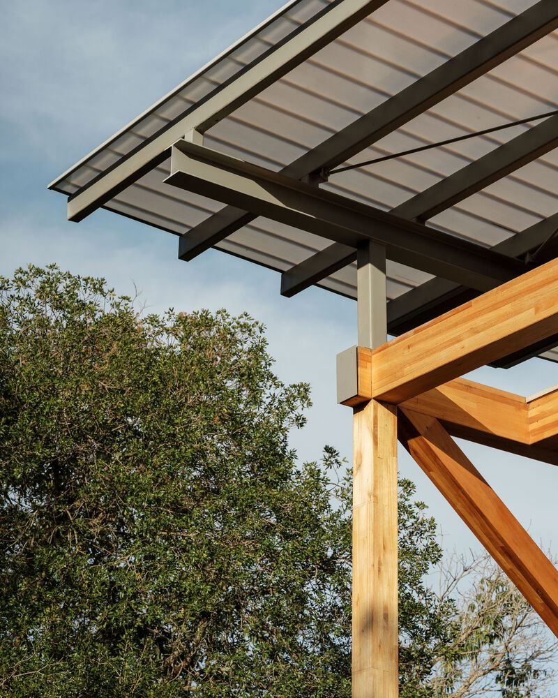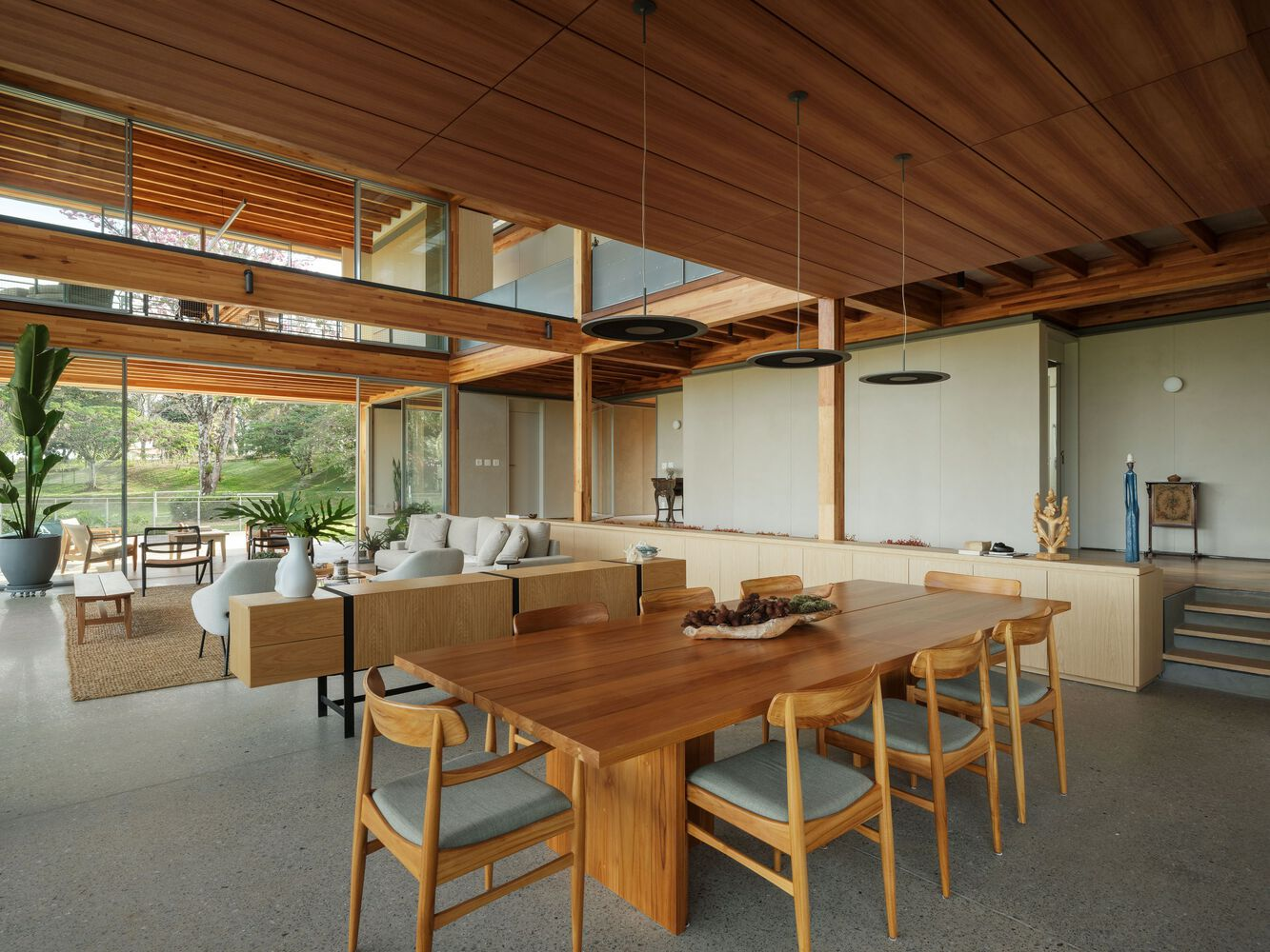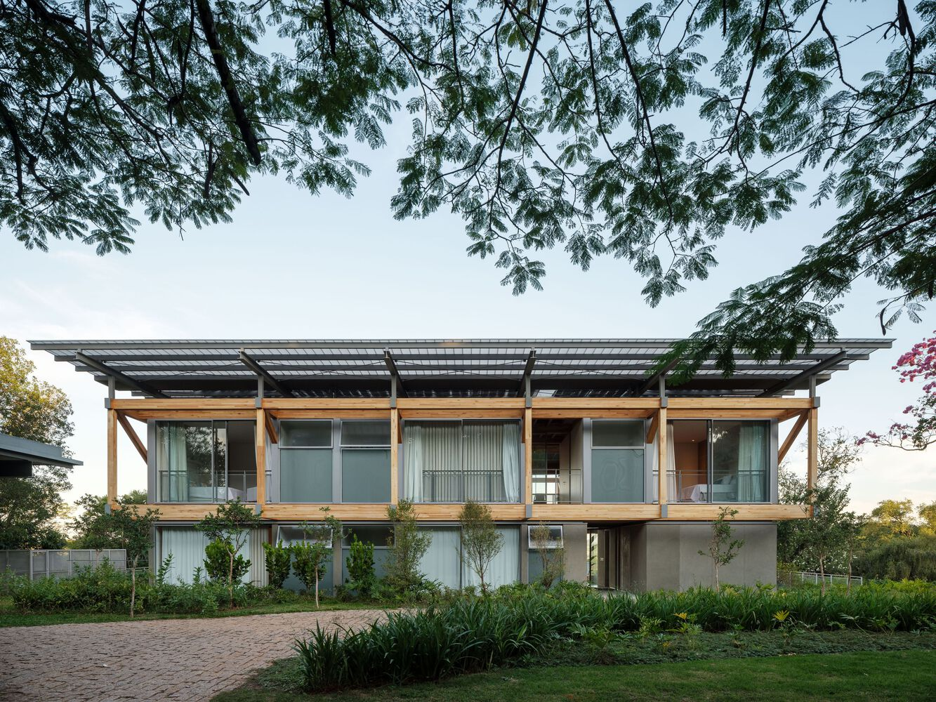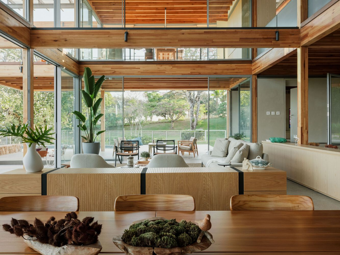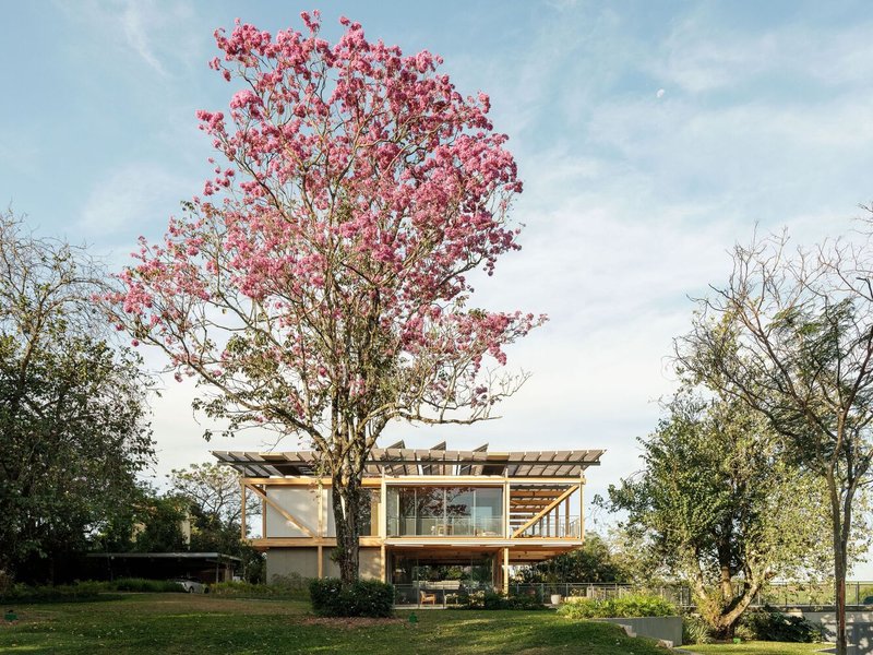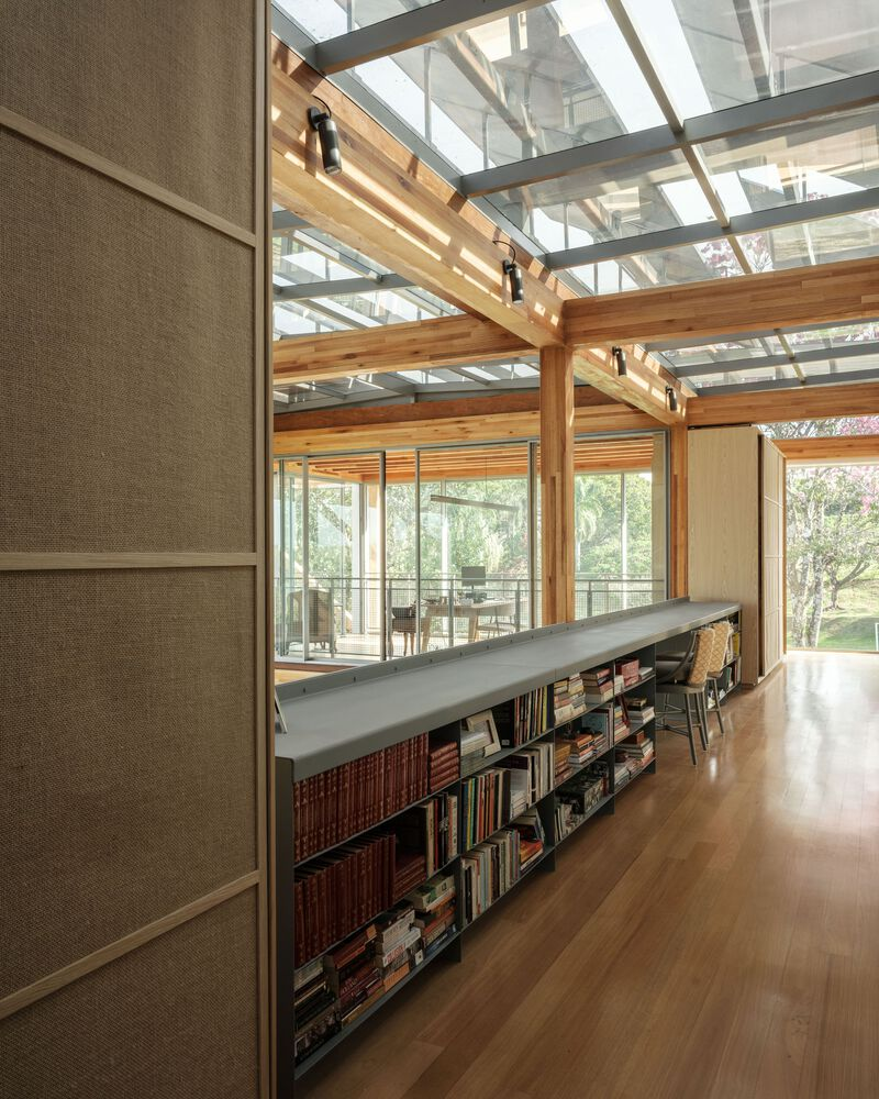 One of the standout features of RF Residence is its structural grid, constructed with glued laminated timber (GLT). This material not only provides structural integrity but also enhances the visual warmth and texture of the home. The GLT grid supports the central living area and extends into cantilevered sections to the north and south, housing the bedrooms, office, and suspended terraces.