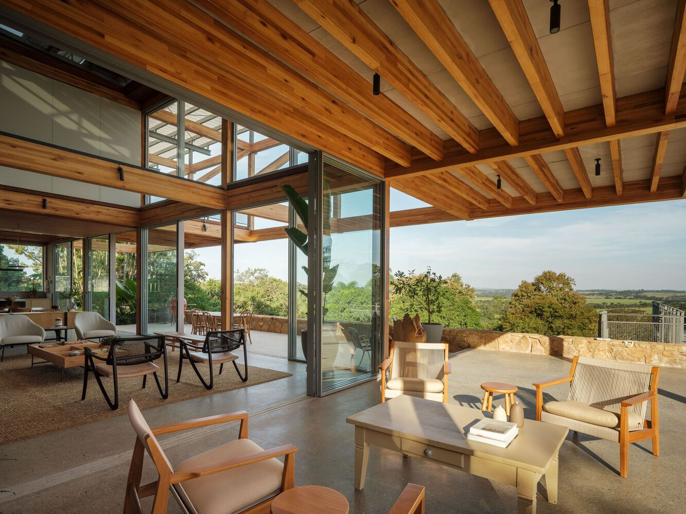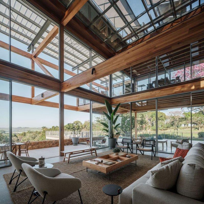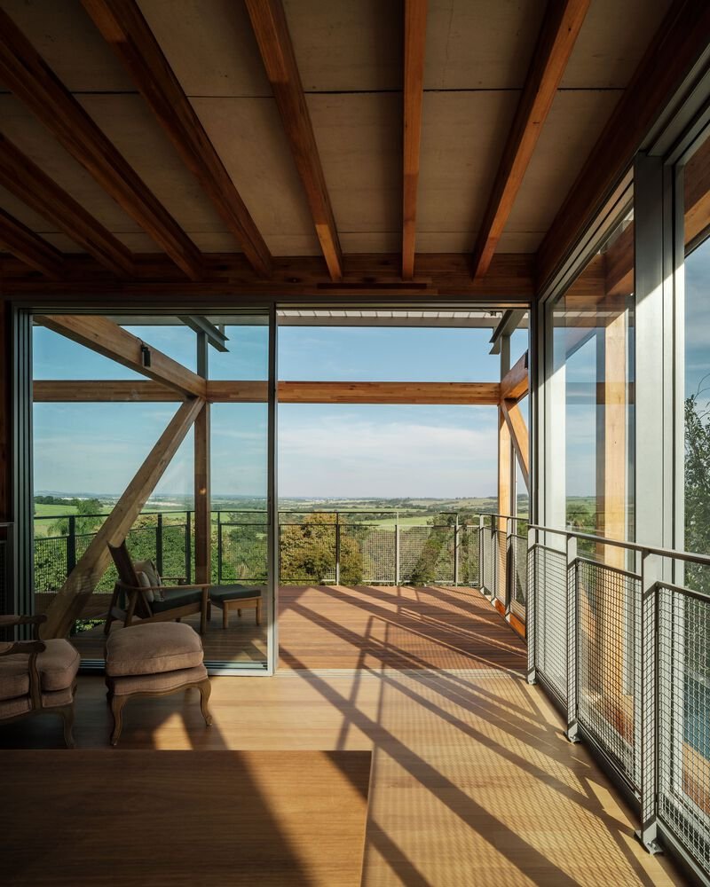 The cantilevers create a unique architectural aesthetic while offering panoramic views of the surrounding valley. This innovative use of GLT reflects a commitment to sustainability and modern construction techniques, ensuring durability and environmental responsibility.