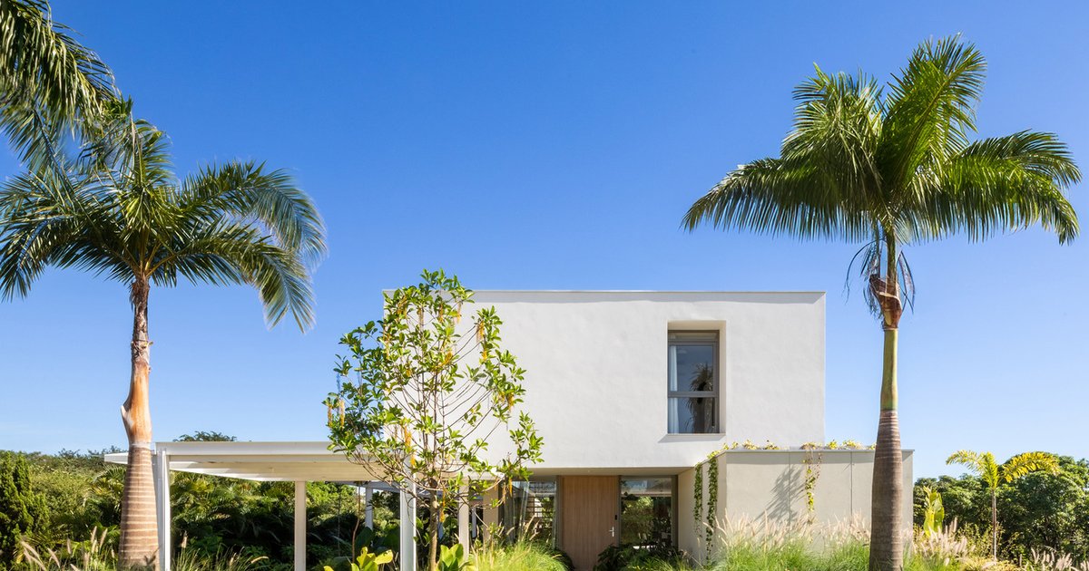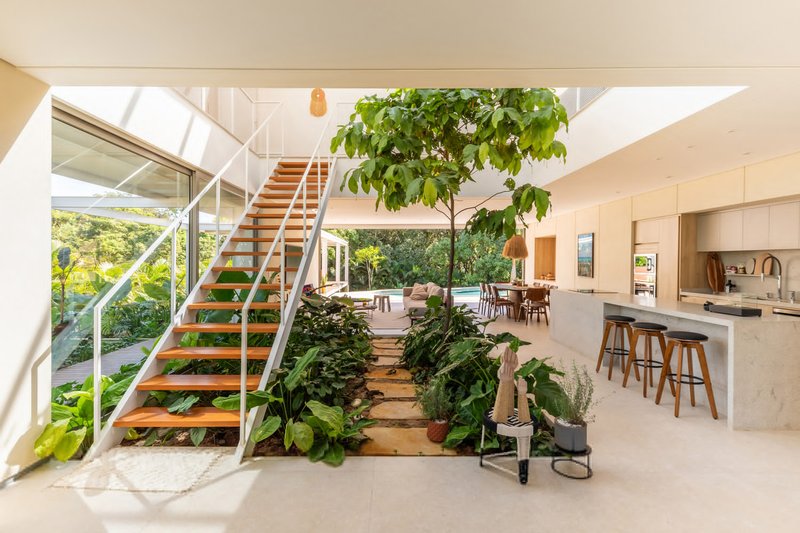 RMG Residence by OTP arquitetura blends indoor and outdoor spaces with a central garden, flexible layout, tropical landscaping, and modern Brazilian design.
