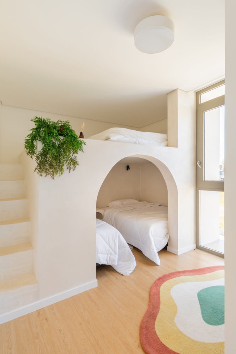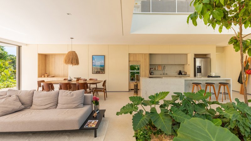 The design emphasizes both structural clarity and aesthetic elegance. The steel and concrete framework defines circulation while supporting open, light-filled interiors. Large zenithal glass openings allow for natural lighting and ventilation, enhancing thermal comfort throughout the day. Interior spaces feature a thoughtful mix of wood finishes, soft furnishings, and minimalist detailing, reinforcing the residence’s contemporary, yet warm, atmosphere.