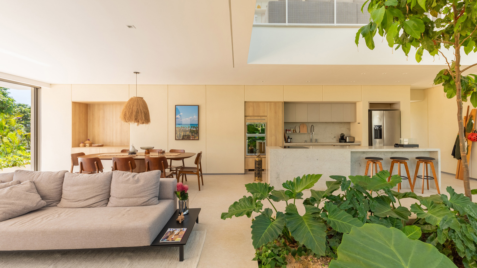 Landscaping plays a pivotal role, employing a tropical language that seamlessly integrates with the architecture. The organic-shaped pool contrasts with the residence’s orthogonal lines, creating a dynamic dialogue between built form and nature. Greenery strategically dissolves the boundaries between indoors and outdoors, while the service areas are discreetly positioned along the lot boundary to maintain privacy.