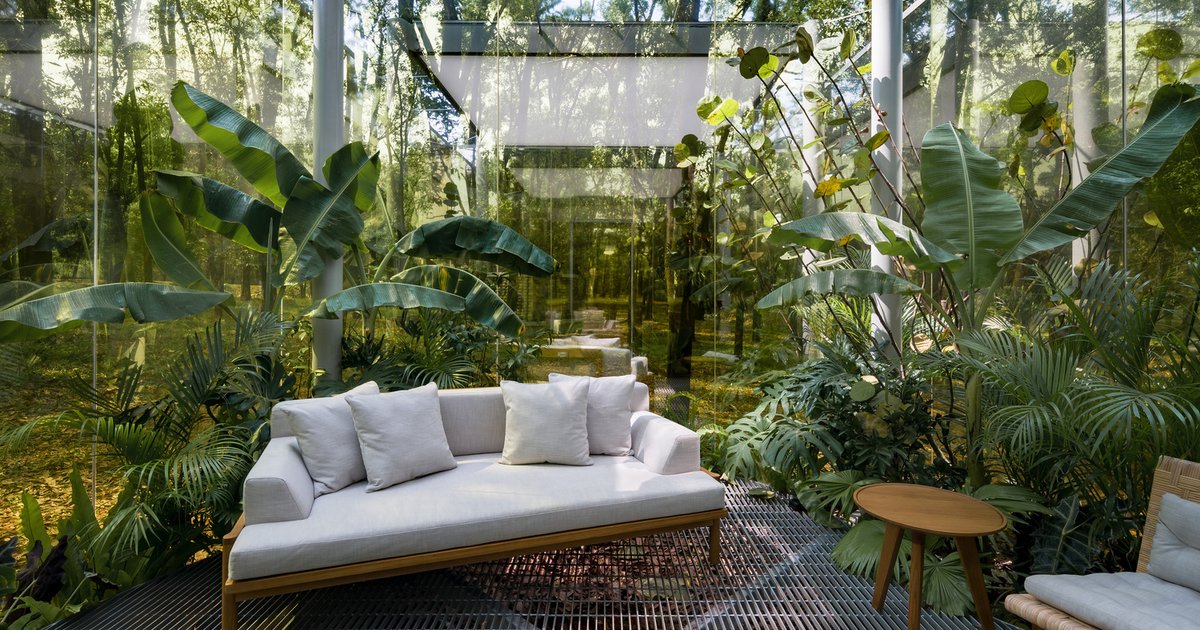 From the outside, the installation appears as a tinted-glass façade surrounded by a dense canopy of trees. By day, the semi-reflective surface mirrors its surroundings, making the structure nearly dissolve into the forest. By night, when illuminated, the pavilion becomes a glowing lantern, its transparency revealing an entirely different character. This transformation highlights how architectural installations can shift identities based on environmental conditions.