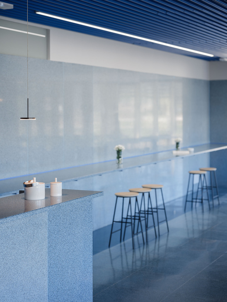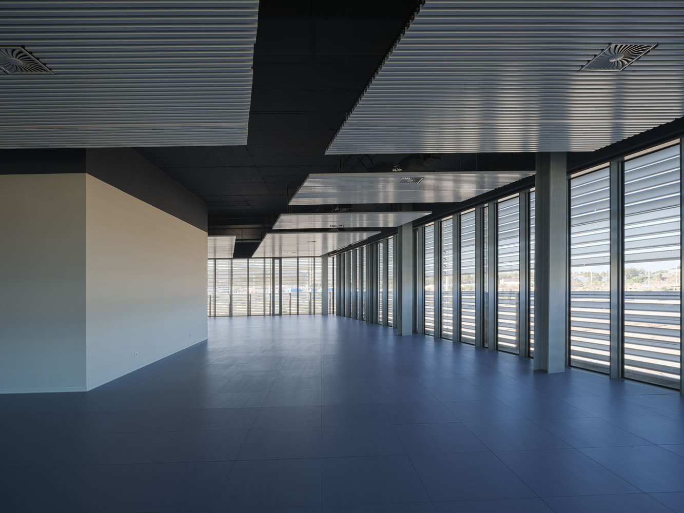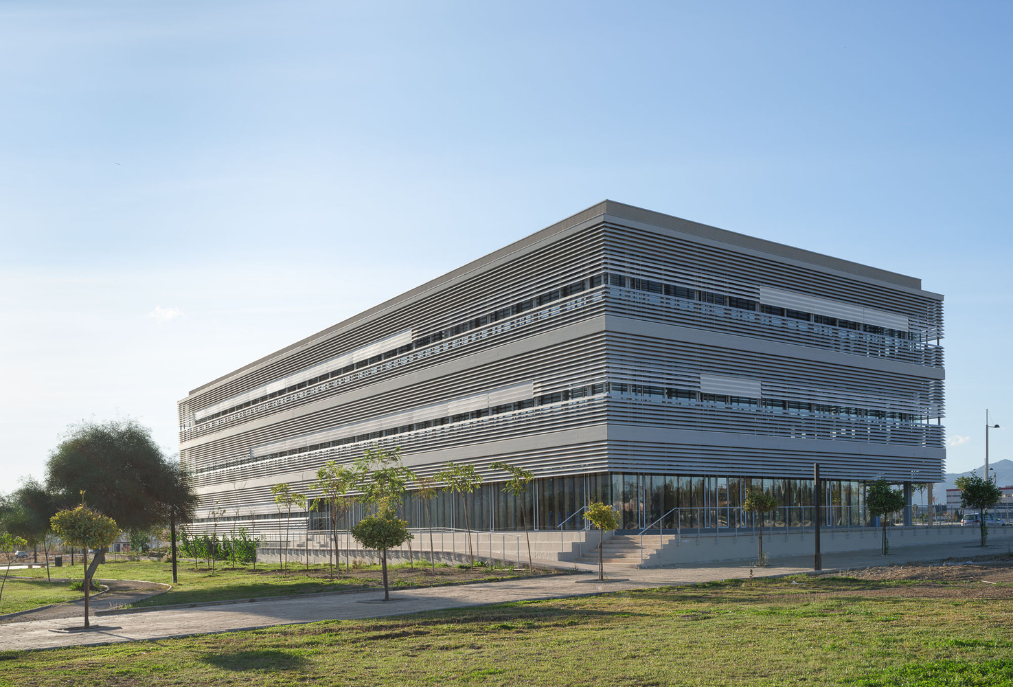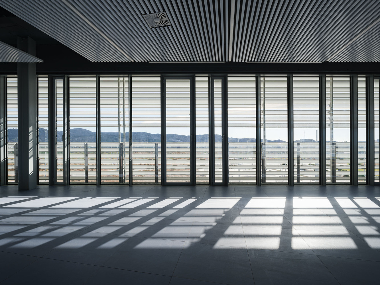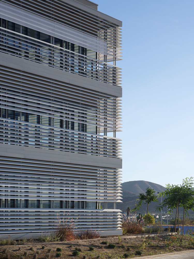 The façade plays a key role in defining the building’s architectural identity. Horizontal strips of fixed and adjustable slats provide solar shading while generating a subtle vibration on the exterior. From within, the long panoramic façades frame views of Málaga’s distant mountains, offering employees a constant visual connection to nature.