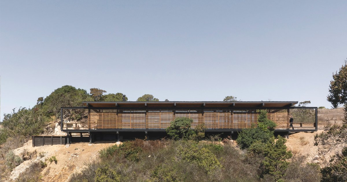 RWO House in Matanzas, Chile, floats above a ridge with a wooden rib structure, steel frame, shutters, and panoramic coastal views.