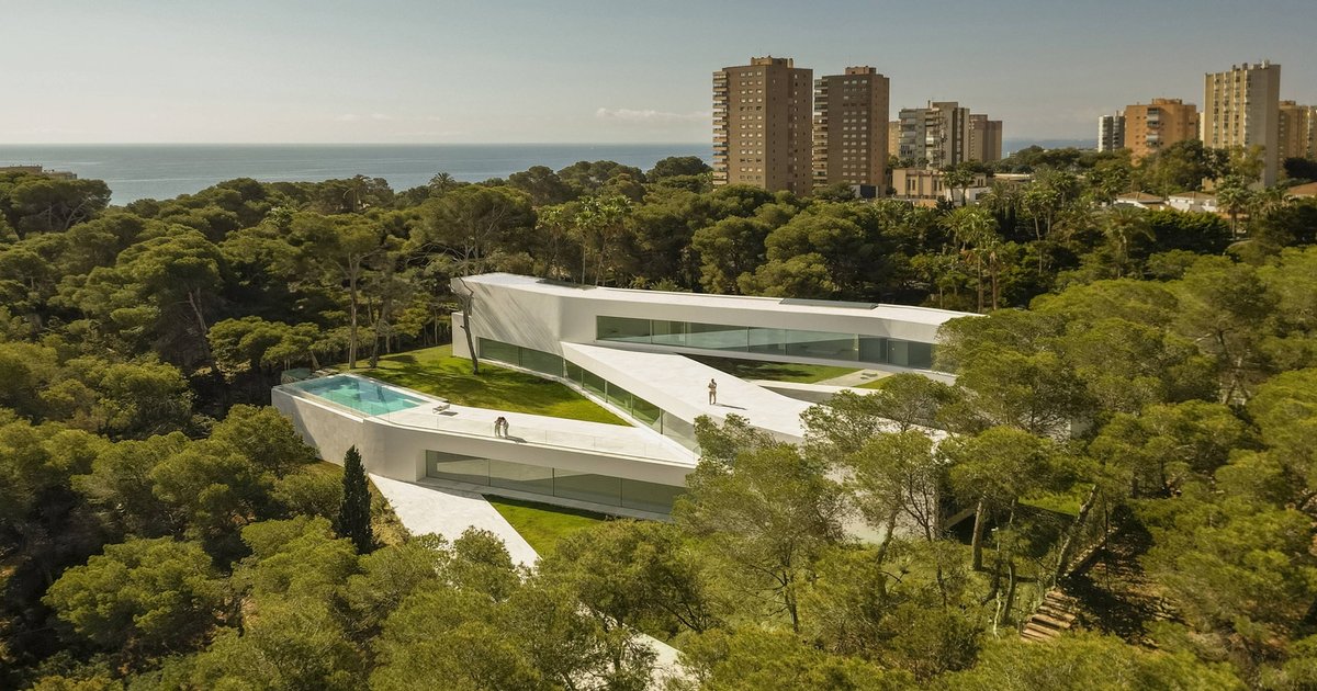 Sabater House is a contemporary Mediterranean residence that explores how architecture can dissolve into landscape through geometry, proportion, and light. Designed by Fran Silvestre Arquitectos, the 780-square-meter house is located in Alicante, Spain, where topography, mature trees, and distant sea views strongly informed the architectural strategy. Rather than adopting a compact volume, the project unfolds as a linear and fragmented system, increasing the perimeter of contact between interior and exterior and generating a sequence of courtyards that appear to extend endlessly into the garden.