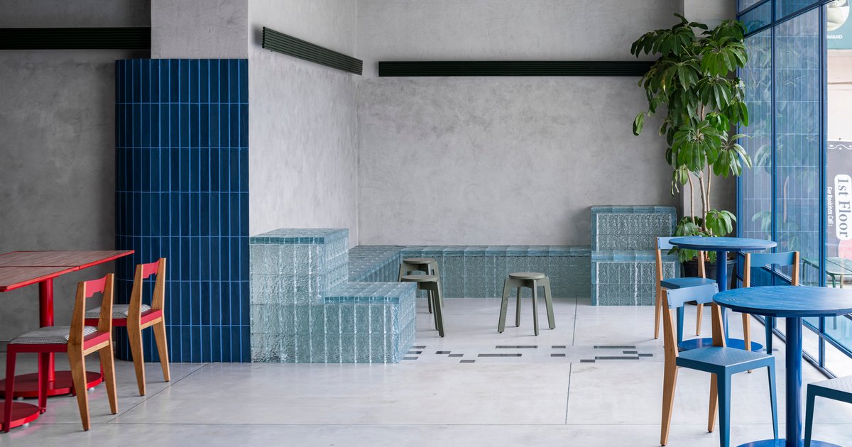 Color is never an afterthought here. It acts as form, hierarchy, and even narrative. Seating elements in deep blue, bright citron, and bold crimson are intentionally spaced, almost like actors in a visual performance, giving the space a theatrical but controlled mise-en-scène.