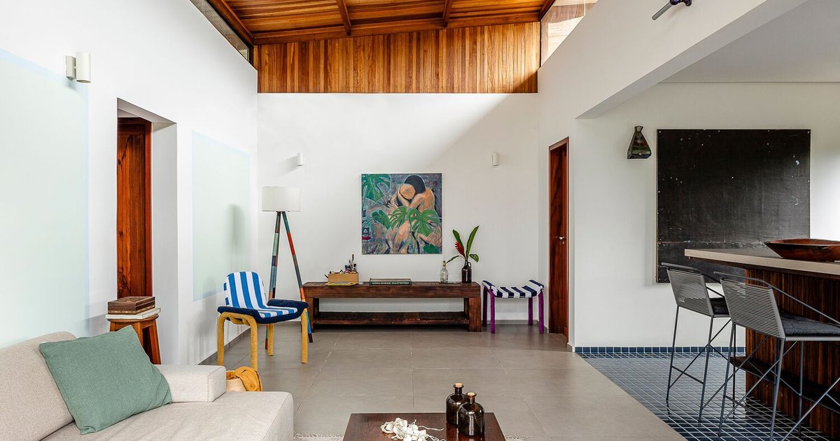 The design allows generous natural lighting and ventilation, reducing energy use while offering expansive sea views. Open spaces further enhance the tropical aesthetic, merging the house with the Atlantic forest.