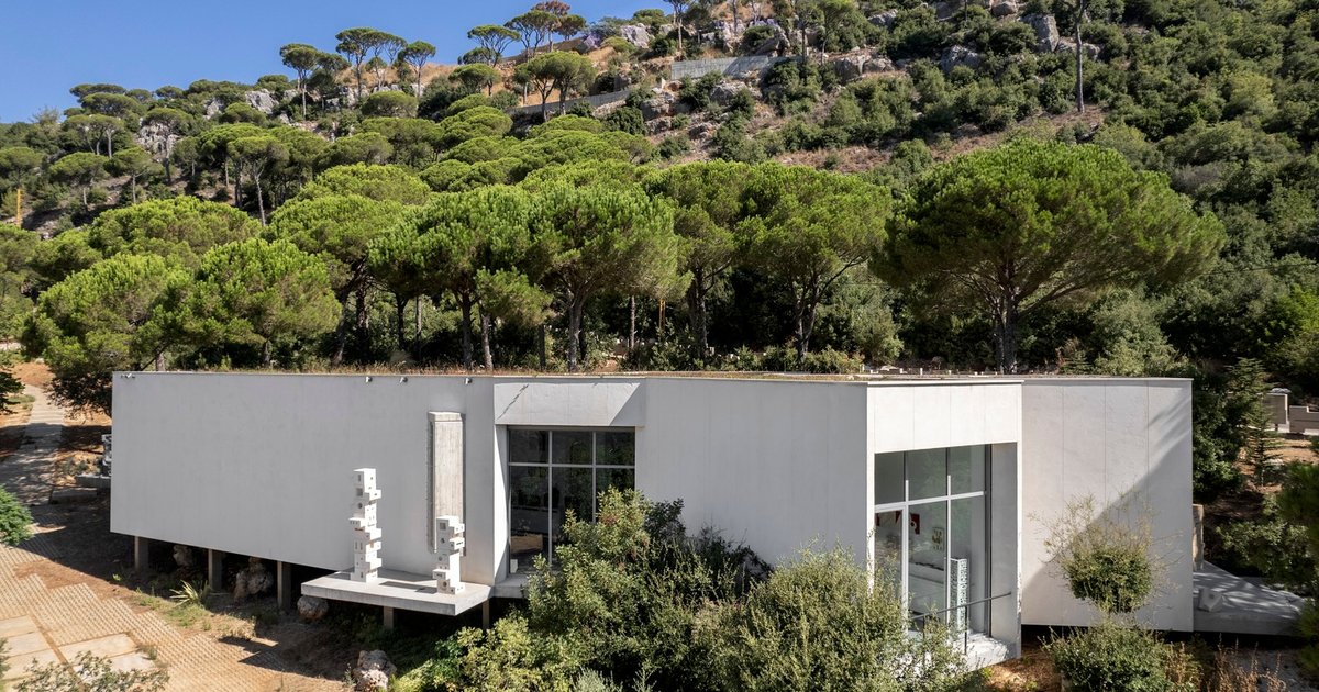 Hybrid gallery and storage in Lebanon, integrating Choucair’s artworks with nature through concrete, glass, and sculptural landscaping.