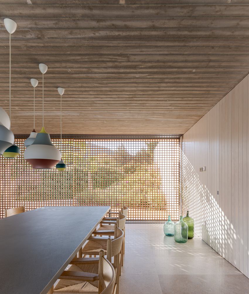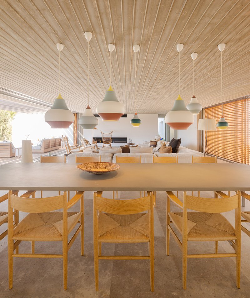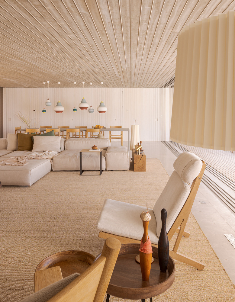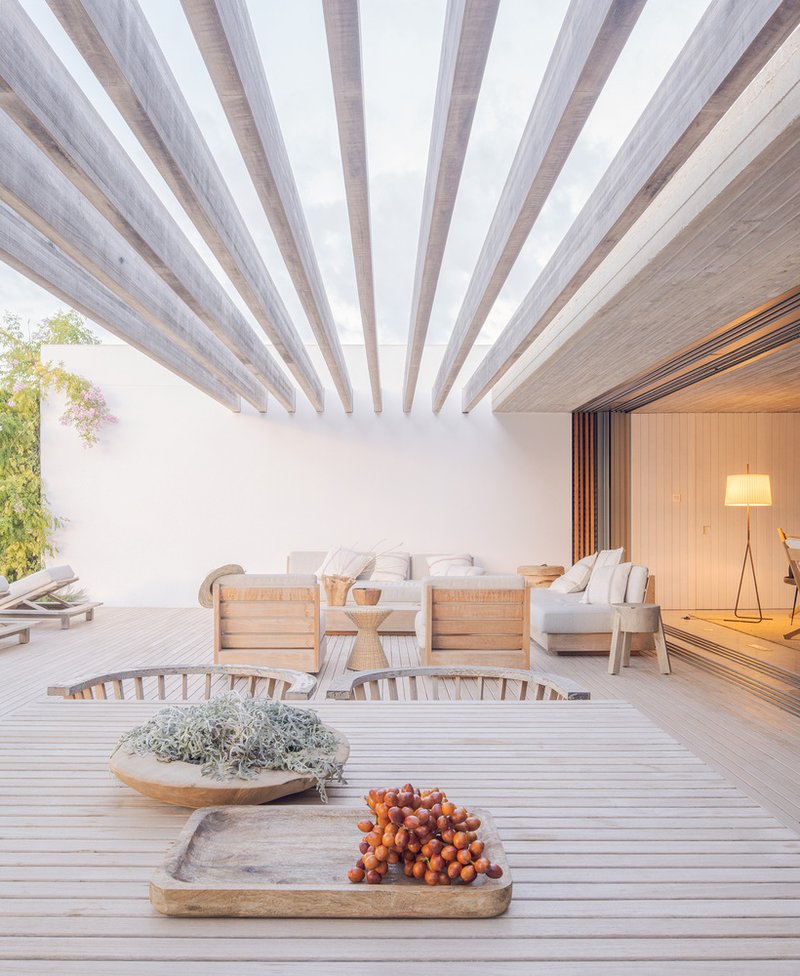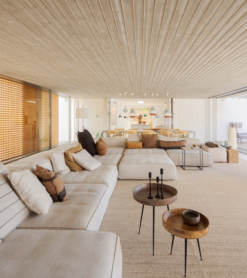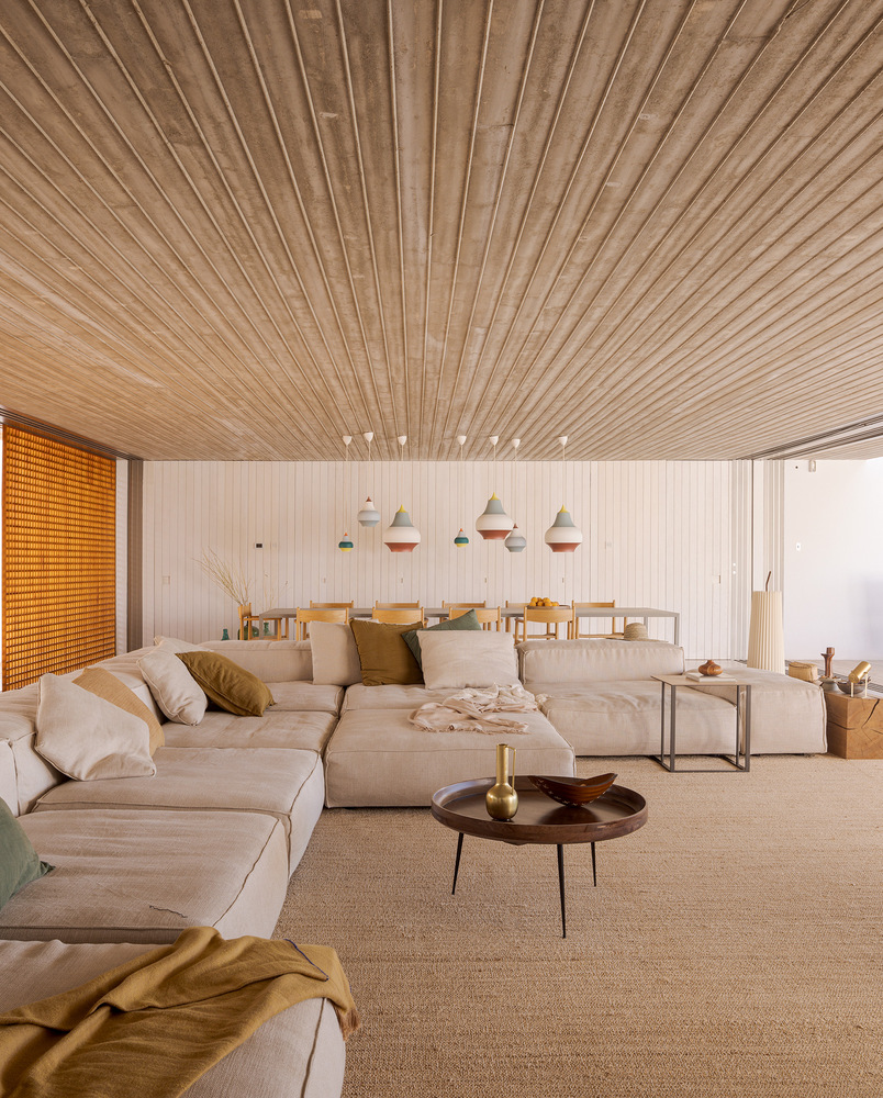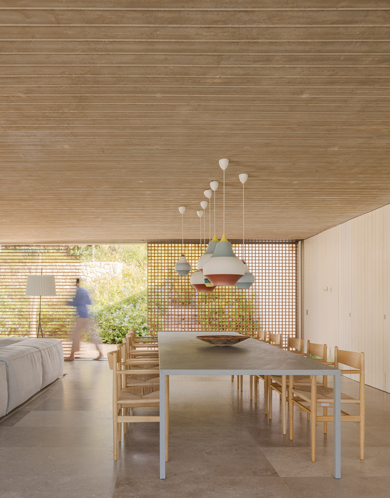 The piazza serves as the heart of the villas, with open-plan layouts that integrate the kitchen and communal areas. Closer to the pools, the ceiling dissolves into a concrete pergola, offering shade to convivial terraces that encourage outdoor living.