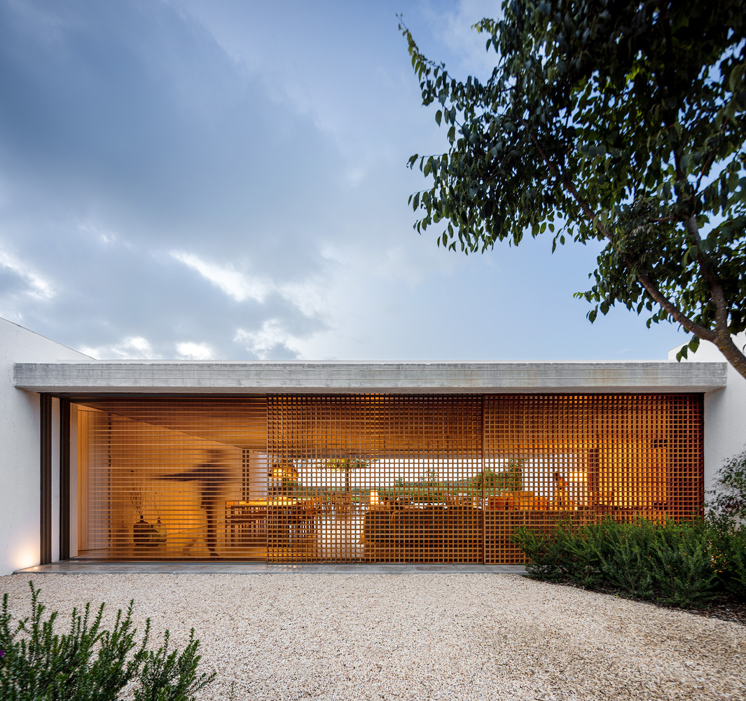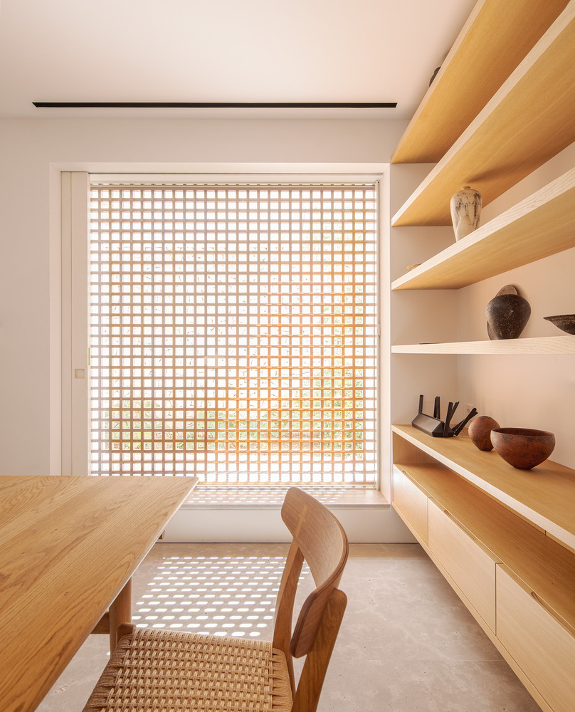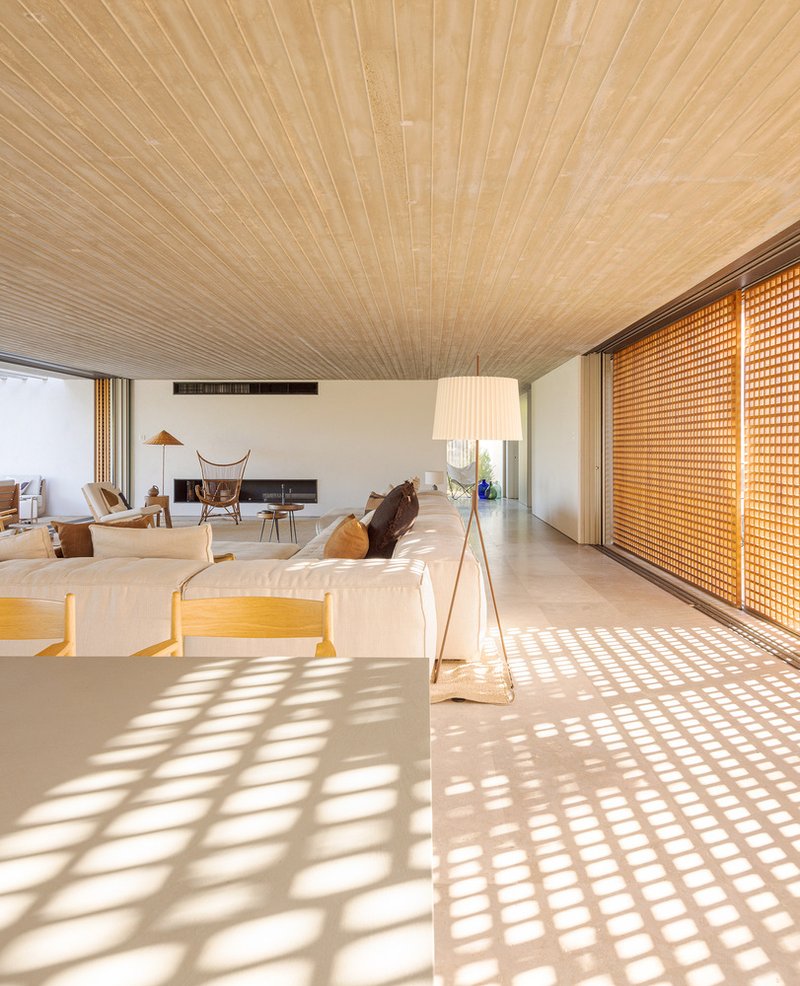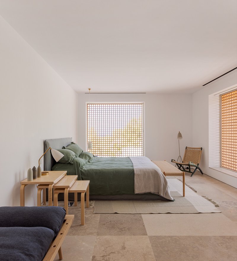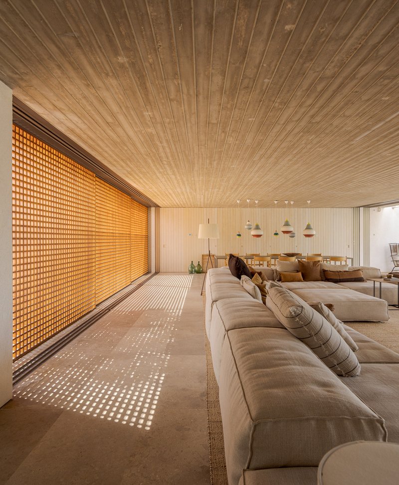 A key design element is the interaction between built structures and the natural environment. The living spaces open to the outdoors through recessed openings and patios that unveil breathtaking views gradually. Retractable wooden sunscreens, inspired by the mashrabiya screens of Arab heritage, provide light filtration, privacy, and aesthetic appeal. These screens, redesigned with a simple checkered pattern, create a harmonious blend of modernity and tradition.