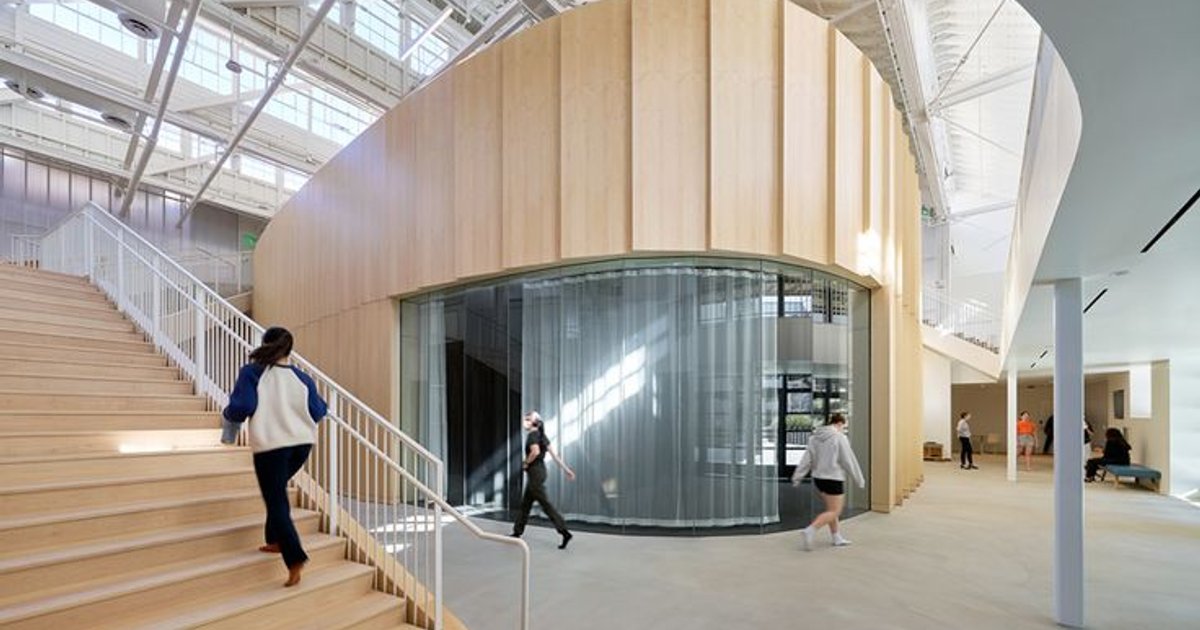 The new design includes a strategic cut through the existing floor, creating vertical transparency and natural circulation across all levels. North-facing clerestory windows, part of the original sawtooth roof, now flood the entire center with natural light—an intentional nod to the ephemeral beauty of dance.