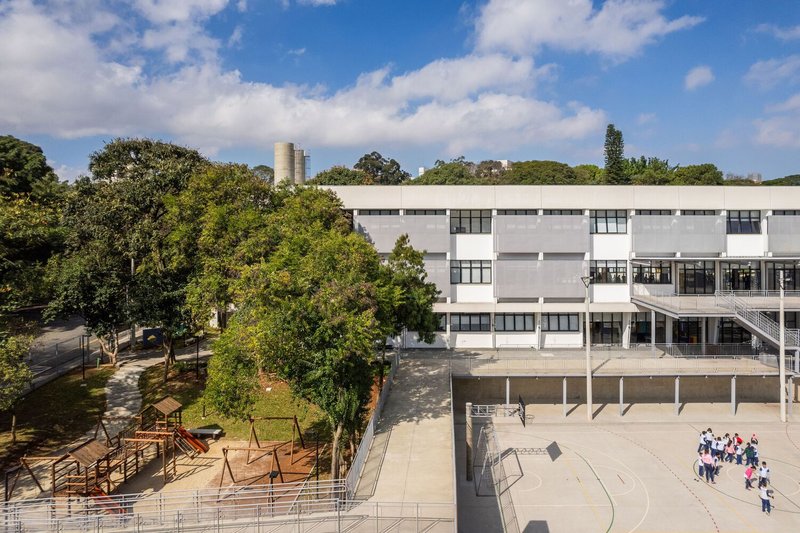 Externally, the landscape design complements the educational program with playgrounds, gardens, a vegetable patch, and three sports courts, one of which was transformed into a covered gymnasium, extending usability throughout the year.