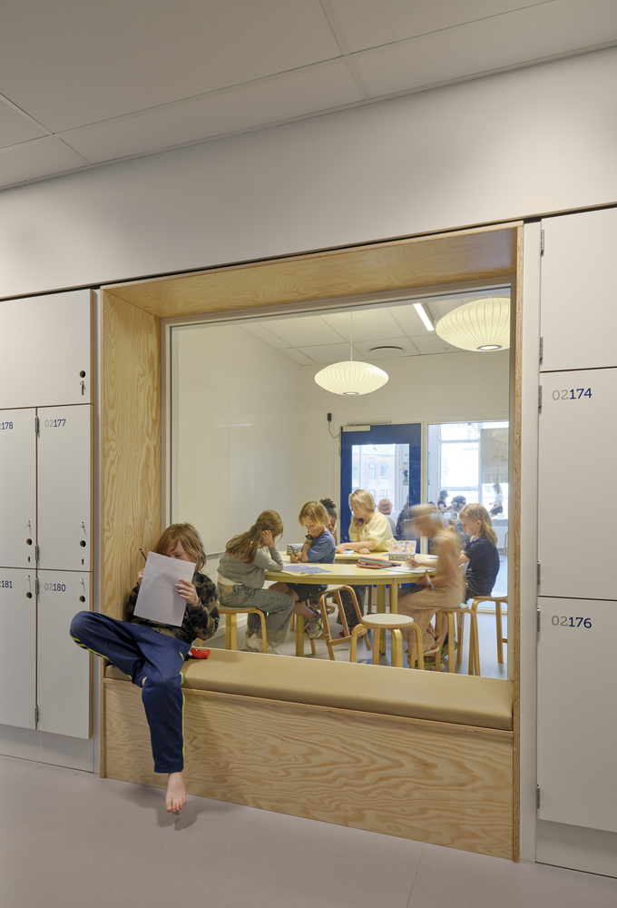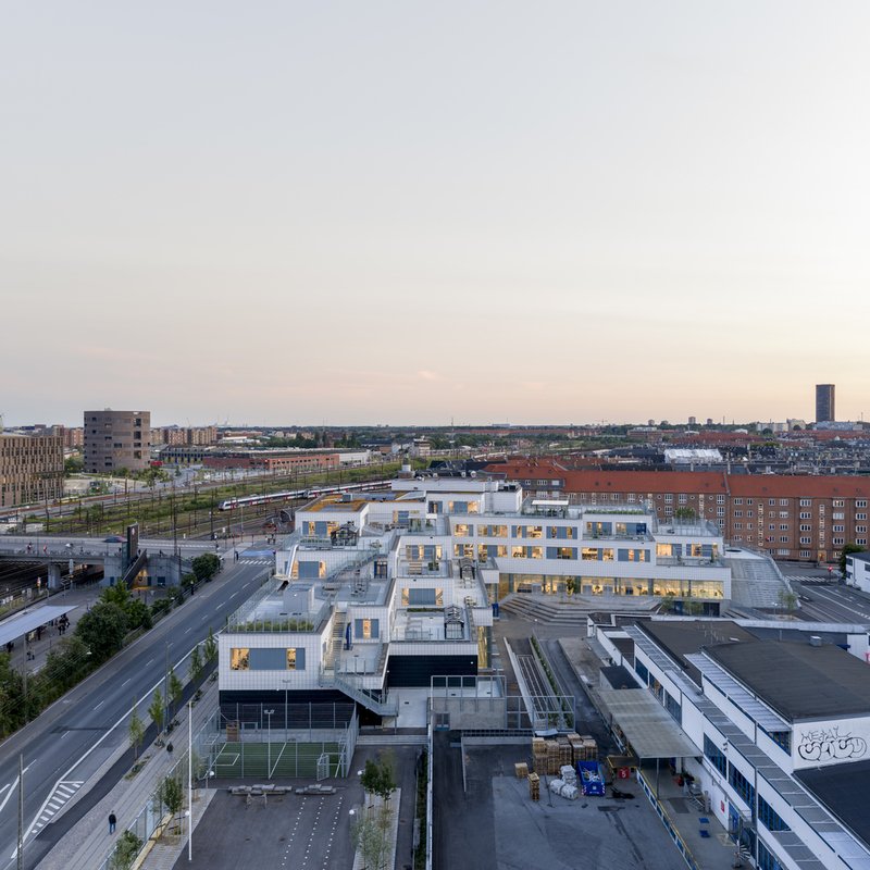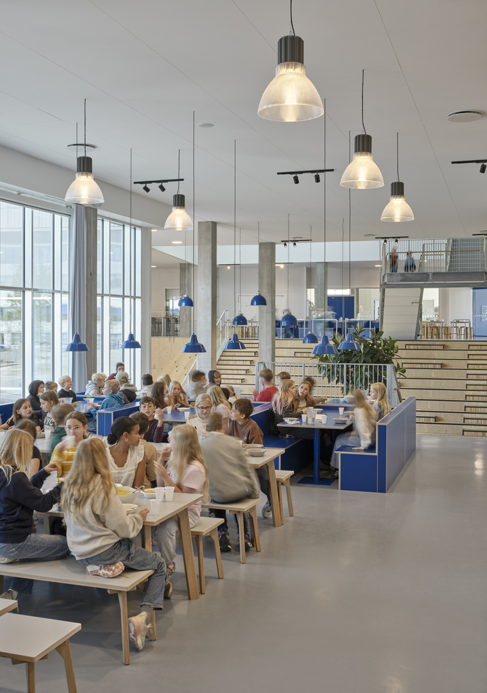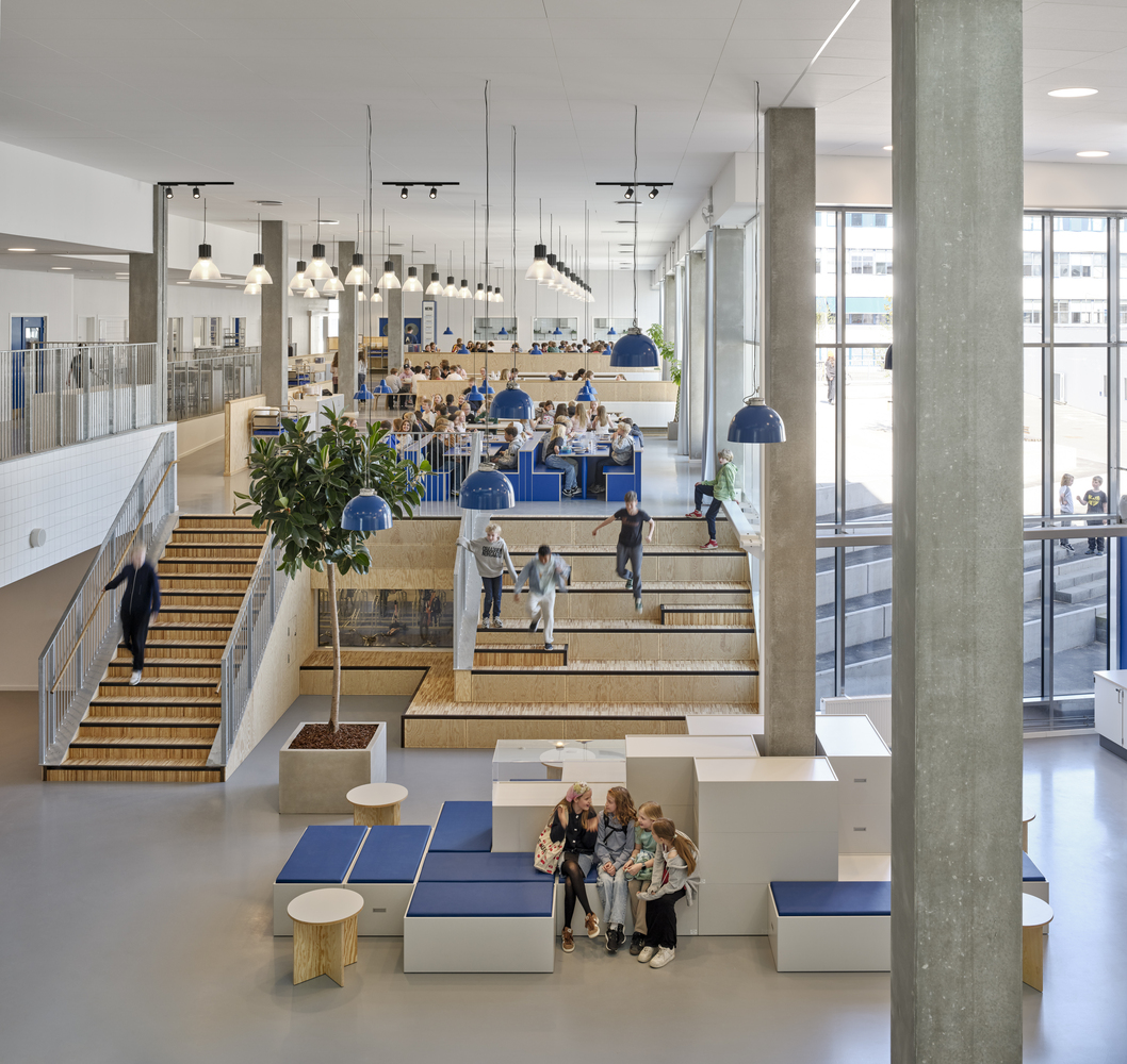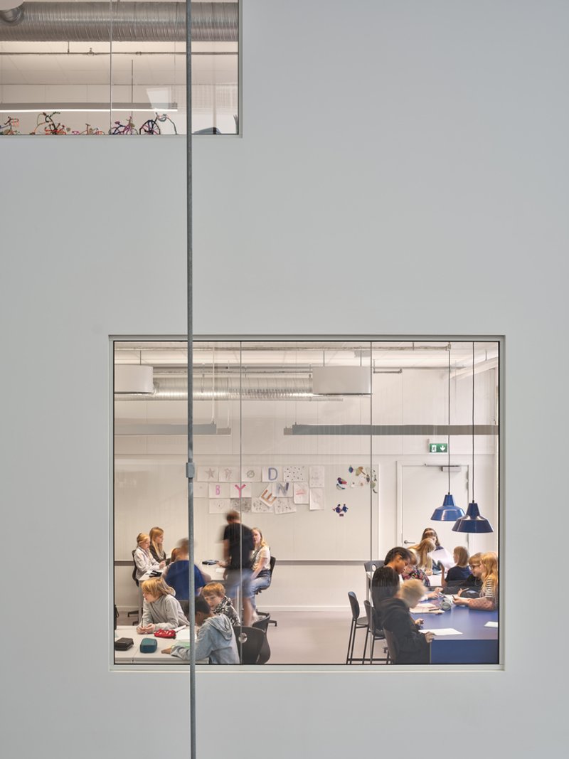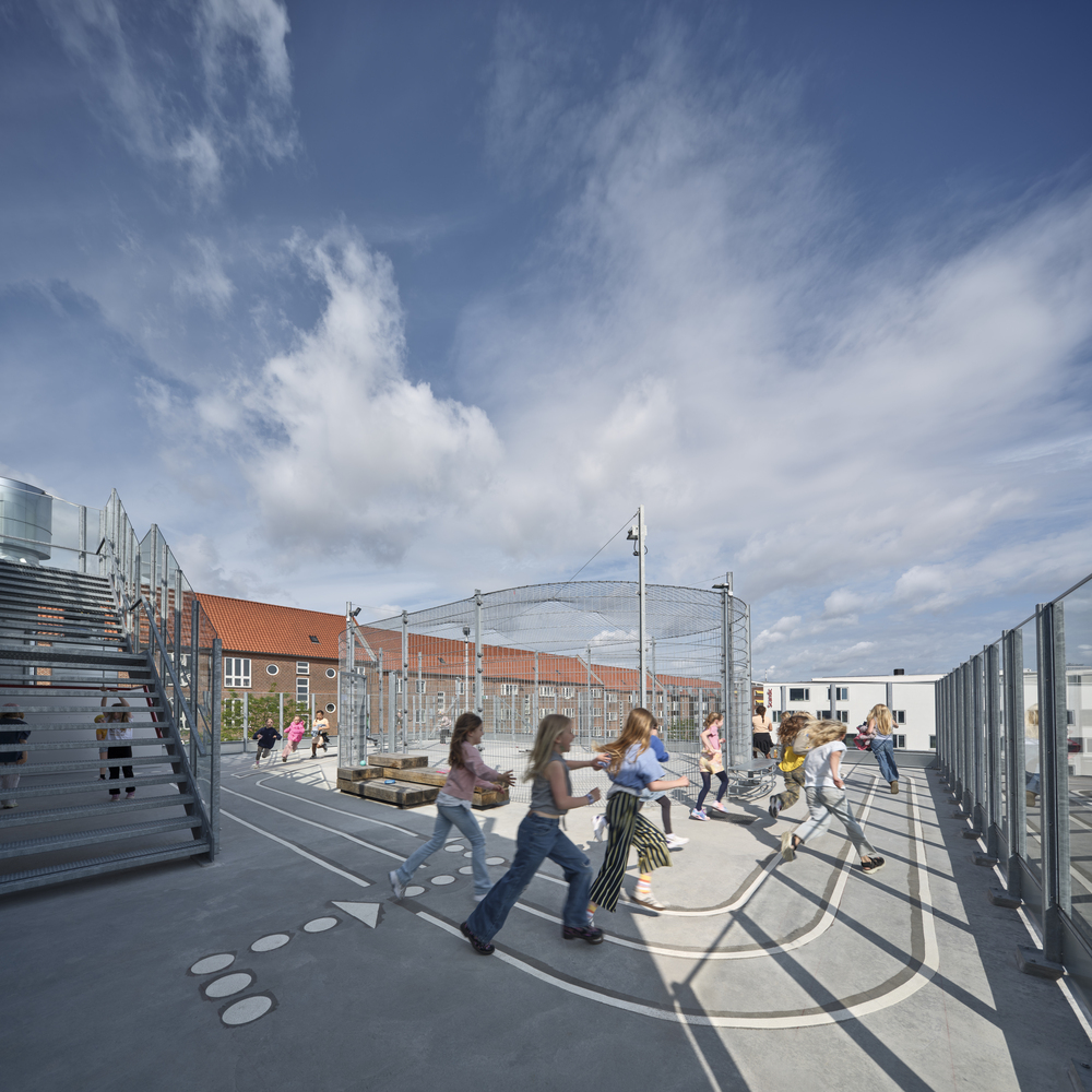 The Tumble Hall, a large corner sports facility with triple-height ceilings, becomes a civic landmark and a spatial anchor, linking the old and new layers of the district. Terraces and classrooms throughout the building offer panoramic views across Copenhagen, allowing the school to participate visually in the life of the city.