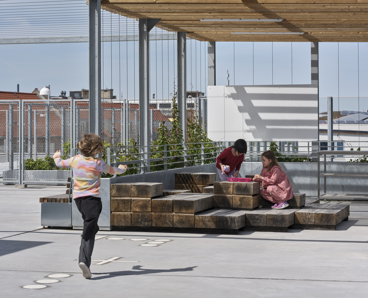 One of the most inventive features of the project is the rooftop schoolyard. Spanning three floors, this continuous outdoor loop provides space for exercise, education, and play. Rather than traditional flat playgrounds, this vertical solution weaves a landscape of terraces into the architectural fabric, connecting classrooms with outdoor learning zones.