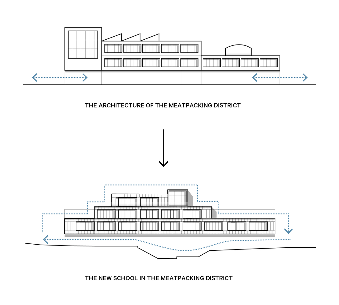 The school is deeply rooted in the architectural character of the White Meatpacking District. The area’s heritage of clean, white functionalism—originally inspired by the 1930 Stockholm World Exhibition—has been respectfully preserved and reinterpreted through a modern lens. The new design embraces the clean lines, tiled facades, and industrial material palette, while introducing human-centered features such as large windows, roof terraces, and high-ceilinged volumes.