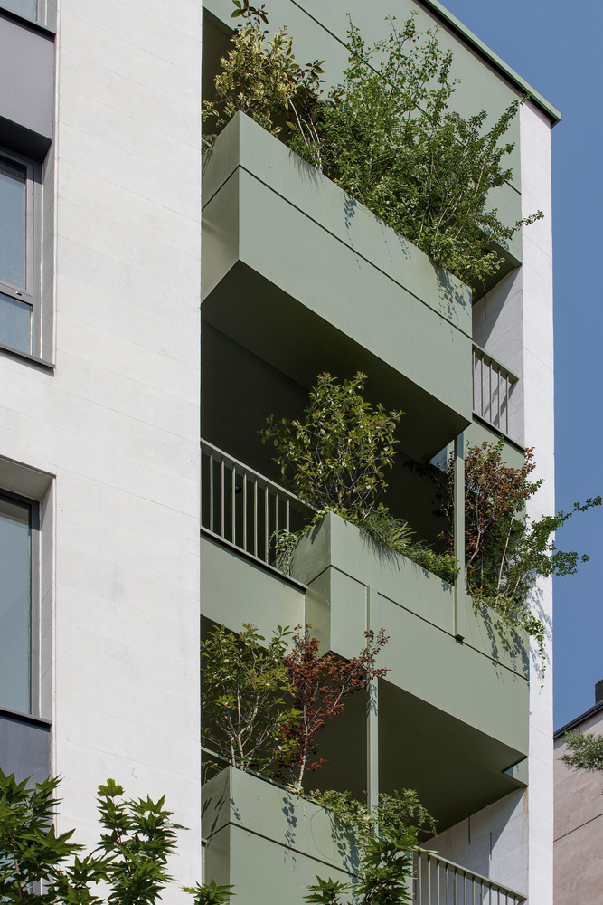 The project’s defining feature lies in the integration of deep planters and delicate metal frameworks, which together form an expressive, layered façade. Each balcony is designed as a “prosthesis” to the building’s volume—a green extension that blurs the line between architecture and landscape.
