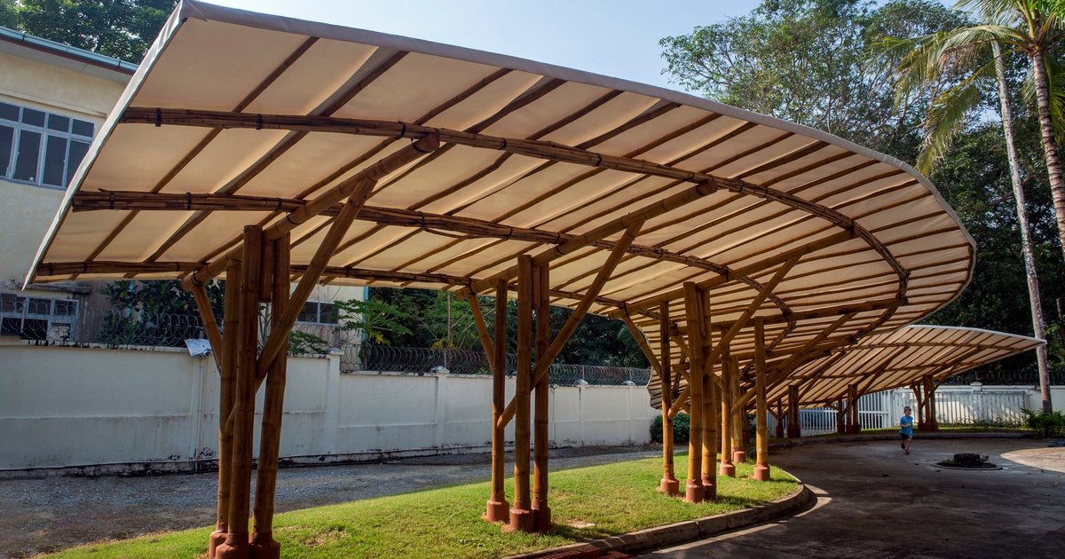 Located in Yangon, the Shade School Playground Pavilion is a lightweight, climate-responsive structure designed by Blue Temple in 2023. Conceived as both a shading device and a cultural event pavilion, the project responds precisely to the environmental, spatial, and social needs of an elementary school campus in a dense urban context.