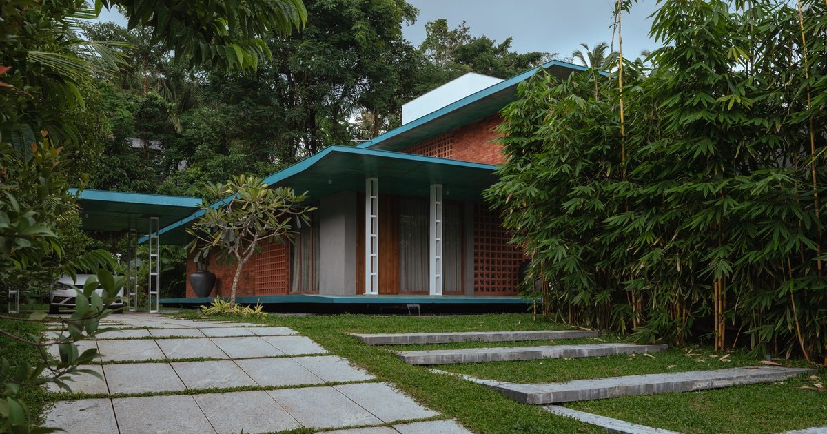 The deep overhangs, combined with exposed brick jali walls, promote cross ventilation and soft, dappled lighting throughout the house. These walls also serve as visual filters that offer privacy without disconnecting the home from its surroundings. In this way, the architecture blurs the line between nature and shelter—a hallmark of tropical modern house design.