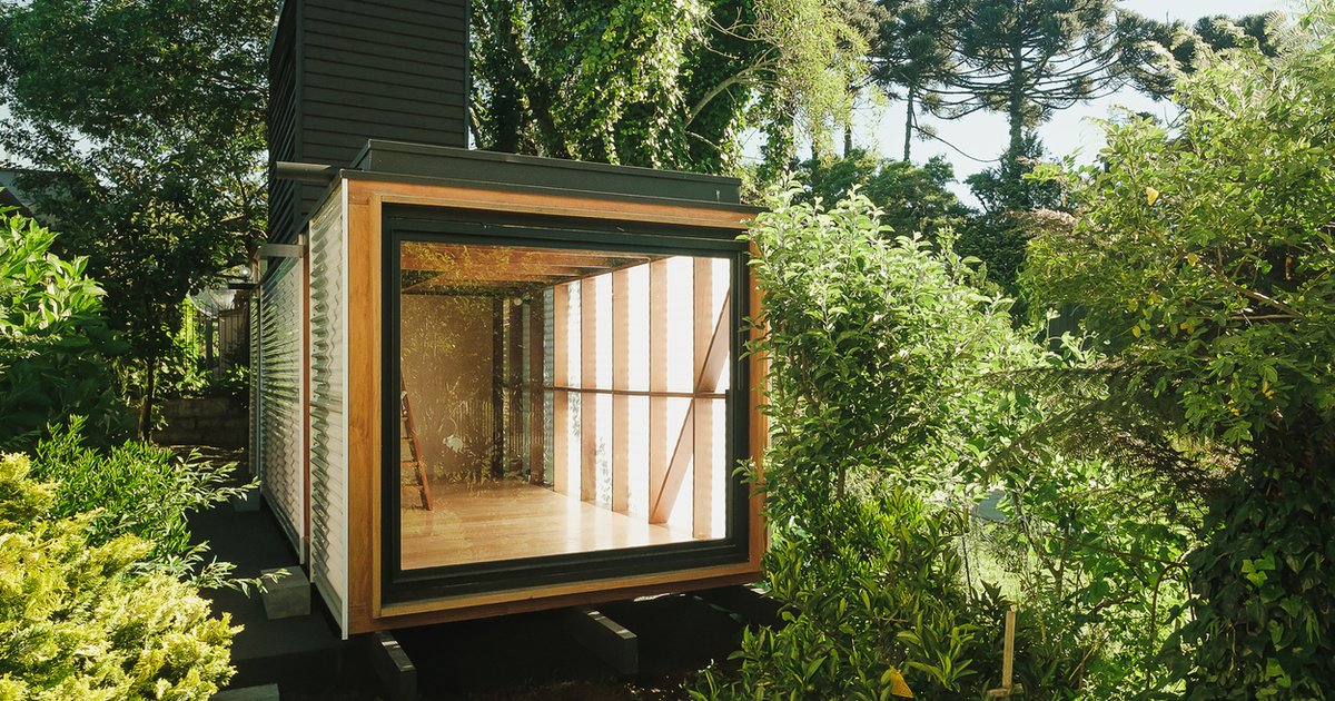 Despite its compact 25-square-meter footprint, the shed maximizes usability by extending upwards. The roof doubles as an elevated garden and seating area, offering an immersive perspective amidst the treetops. A skylight above the staircase provides framed views of the sky, while a north-facing pivot window captures the surrounding landscape.
