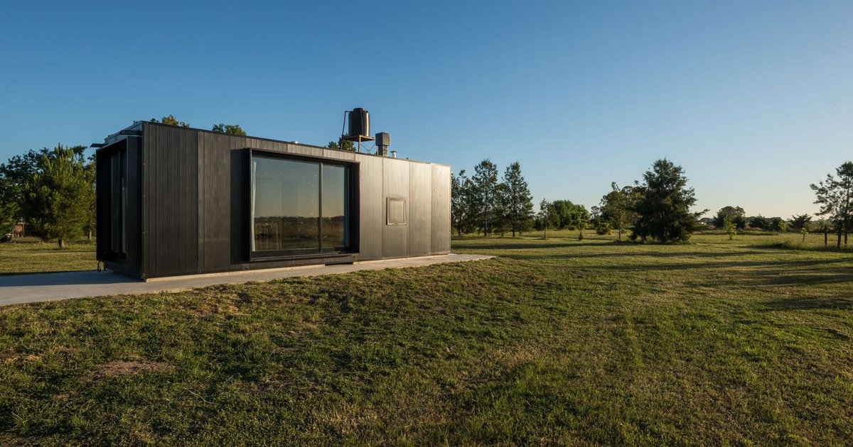 Compact prefabricated shelter in La Plata blends flexibility, natural views, and thermal comfort, creating a multifunctional rural retreat.
