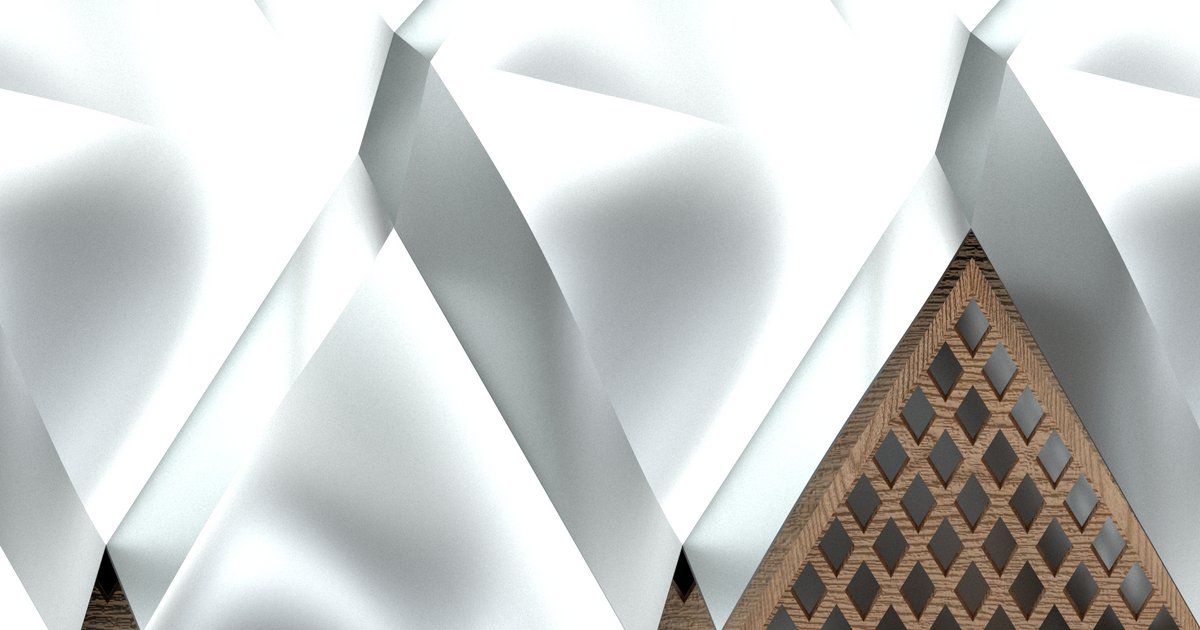 The entire being of the Shirakawa-go Cultural Centre is made up of three wooden shells shaped as vaults. These shells are made up of a repetitive network of adjacent modules. Each module is made up of a framed grill and a cover. The diamond shape of the module is inspired by the Gassho house and its reflection from a body of water in front of it. The module itself is made with a grill to accommodate natural lighting and ventilation for the interior spaces. However, certain external conditions such as heavy snow in winter were considered, and so some parts of the shell were fitted with modules that has solid wood centers, covered in two layers of glass, as a form of insulation. The shells use new material such as steel for the cover, which is made to resemble fish scales in a manner of flaring out to ensure easy sloping of natural materials such as snow or rain. However, some portions of the covering on each shell are made with perforations to allow sunlight to come through. These features allow the Shirakawa-go Cultural Centre to be sustainable, and the inspiration that brought forth this idea came from the Gassho house.