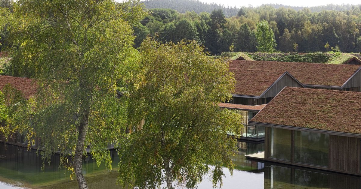 Every structure reflects the genius loci of the site, honoring local building traditions through the use of wooden cladding, green roofs, and understated forms that appear to float gently on the lake.