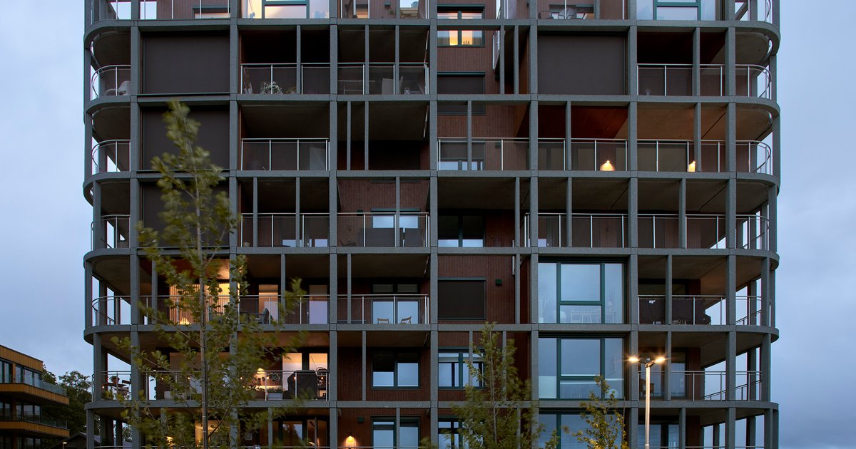 A sculptural Norwegian residential tower featuring a CO₂-absorbing exoskeleton, wooden façades, and layered outdoor living spaces near a transit hub.