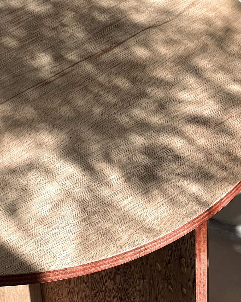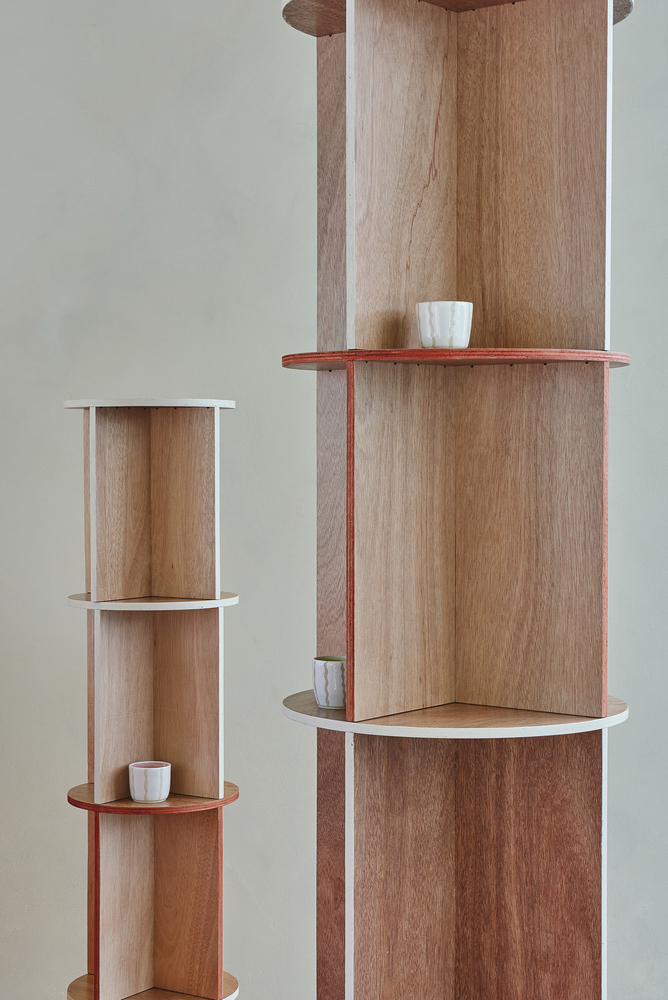 Inside, the layout is dominated by a stacked built-in furniture system that anchors the space both functionally and visually. These built-ins create a continuous, sculptural volume that houses shelving, display, and seating functions. Materials such as warm wood tones and smooth finishes lend a comforting textural balance, transforming functional storage and display into an integral design language.