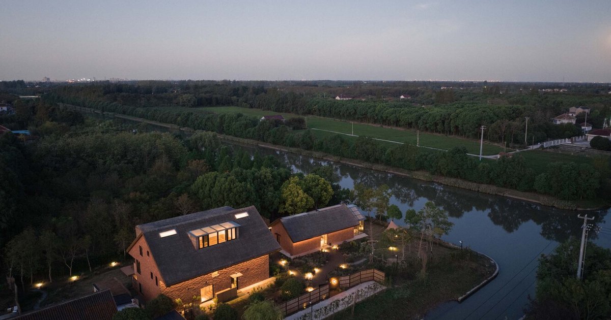 Sustainable boutique hotel in Shanghai blending adaptive reuse, natural materials, vernacular craftsmanship, and slow living within a serene countryside landscape.