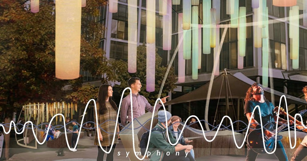 Set amidst the structured city blocks of East London, Symphony introduces a system of sound-reactive lighting elements suspended within a lightweight, curved metal structure. At the heart of this installation are fabric-wrapped vertical tubes that pulse and glow in response to the ambient sounds of the square—from footsteps to live performances. As evening falls, the installation comes alive with multicoloured reflections, bringing a sense of vibrancy and safety to an otherwise rigid commercial zone.