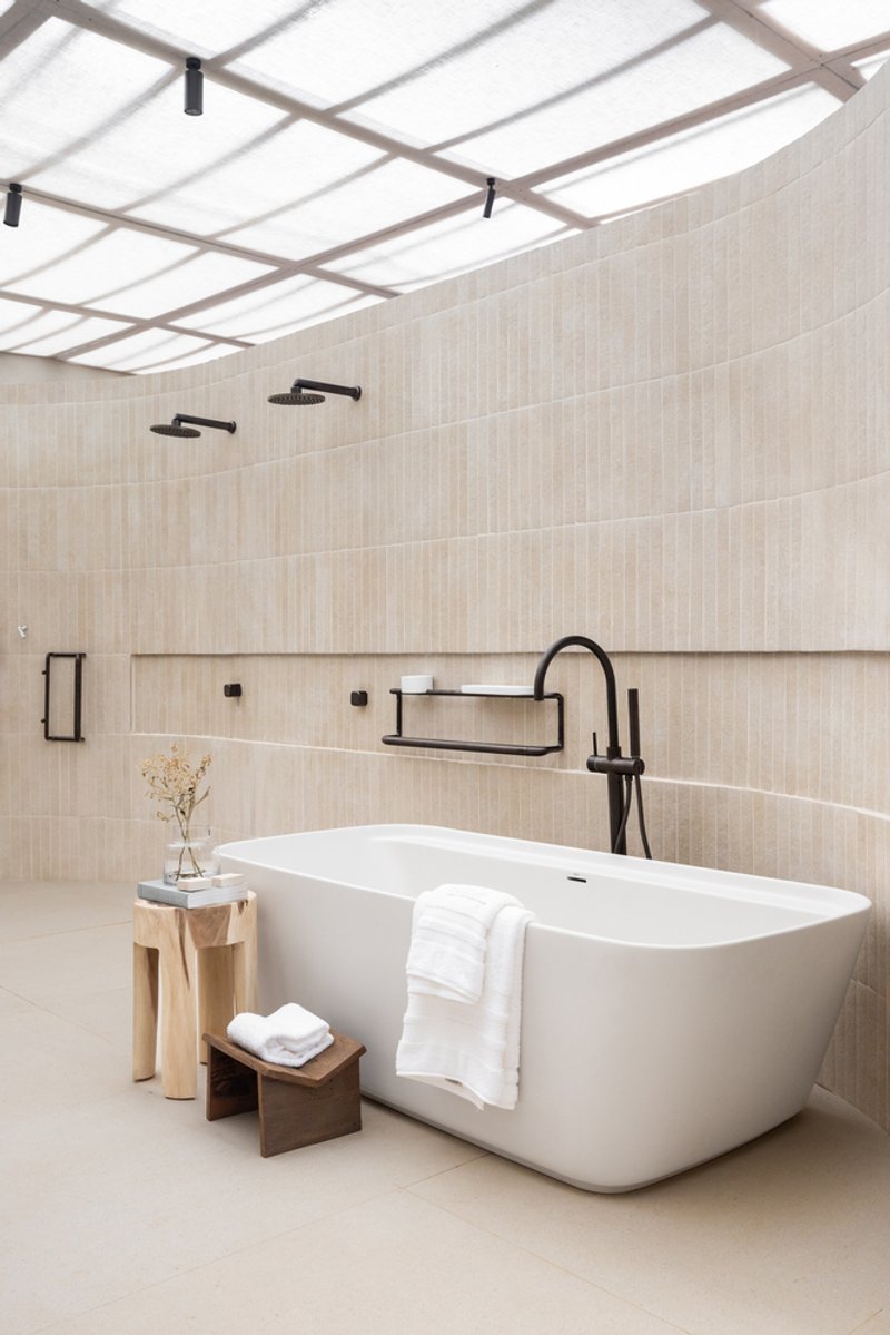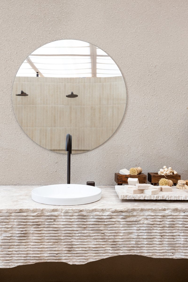 The materials used in the Naz Spa are integral to its design. Beige tones dominate the space, evoking a sense of warmth, calm, and simplicity. Natural elements like hand-carved stone and porcelain tiles with a mineral texture are used throughout to create an organic, grounded feel. These materials also contribute to the spa's theme of natural healing—creating a space that feels harmonious and aligned with nature.