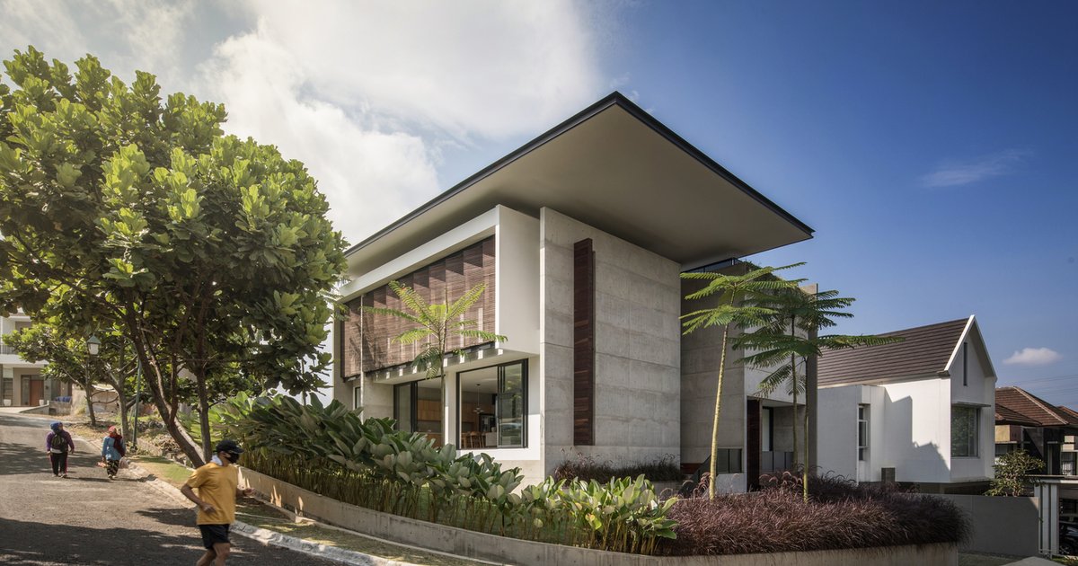 Modern tropical house in Bandung featuring concrete facades, natural ventilation, central garden void, and climate-responsive design for comfortable family living.