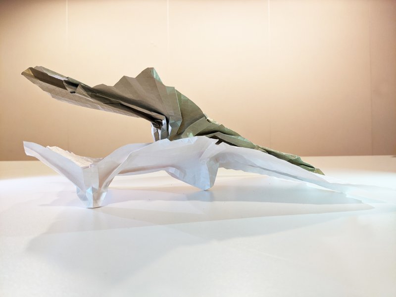 While a triangular grid tessellated our A3 paper in a regular fashion, we formed structures asymmetric and irregular. Using varying pleat widths for varied column heights created pleat rivers that joined to produce rivers that no longer flowed along the original underlying grid, either in width or angle. From our initial scaffold the rivers had deviated and escaped. The grid attempted an initial geometric order, but the rebellious pleats stirred a striking visual tension. Our untamed structures nevertheless showcase the underlying origami geometric constraints.