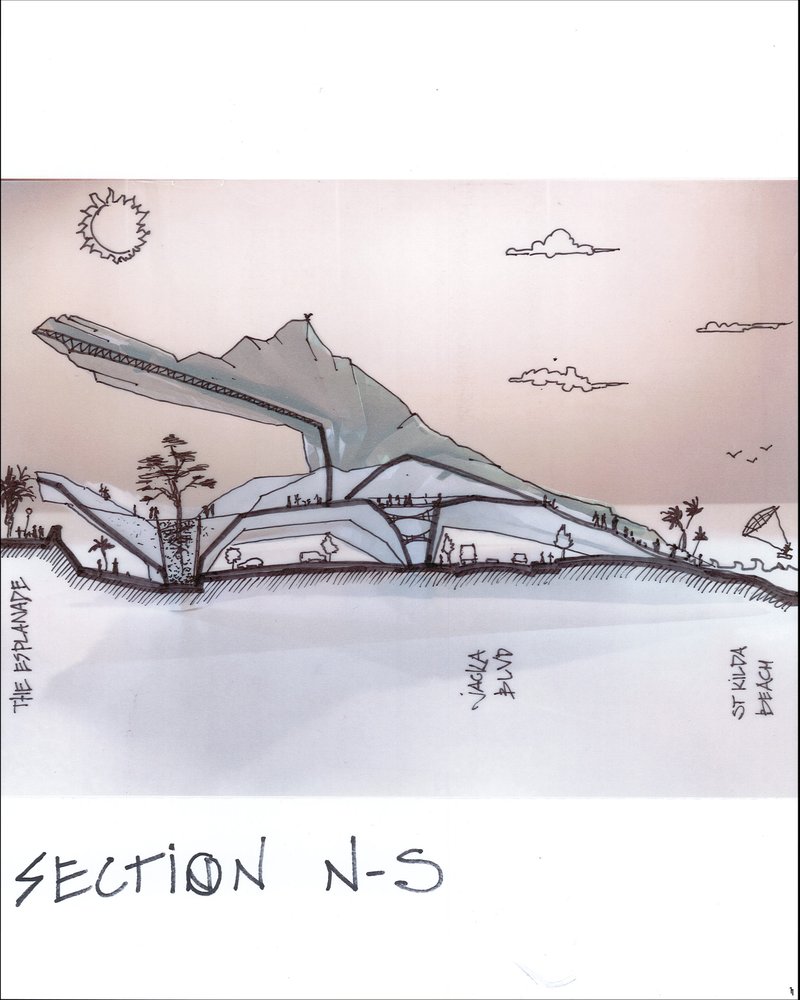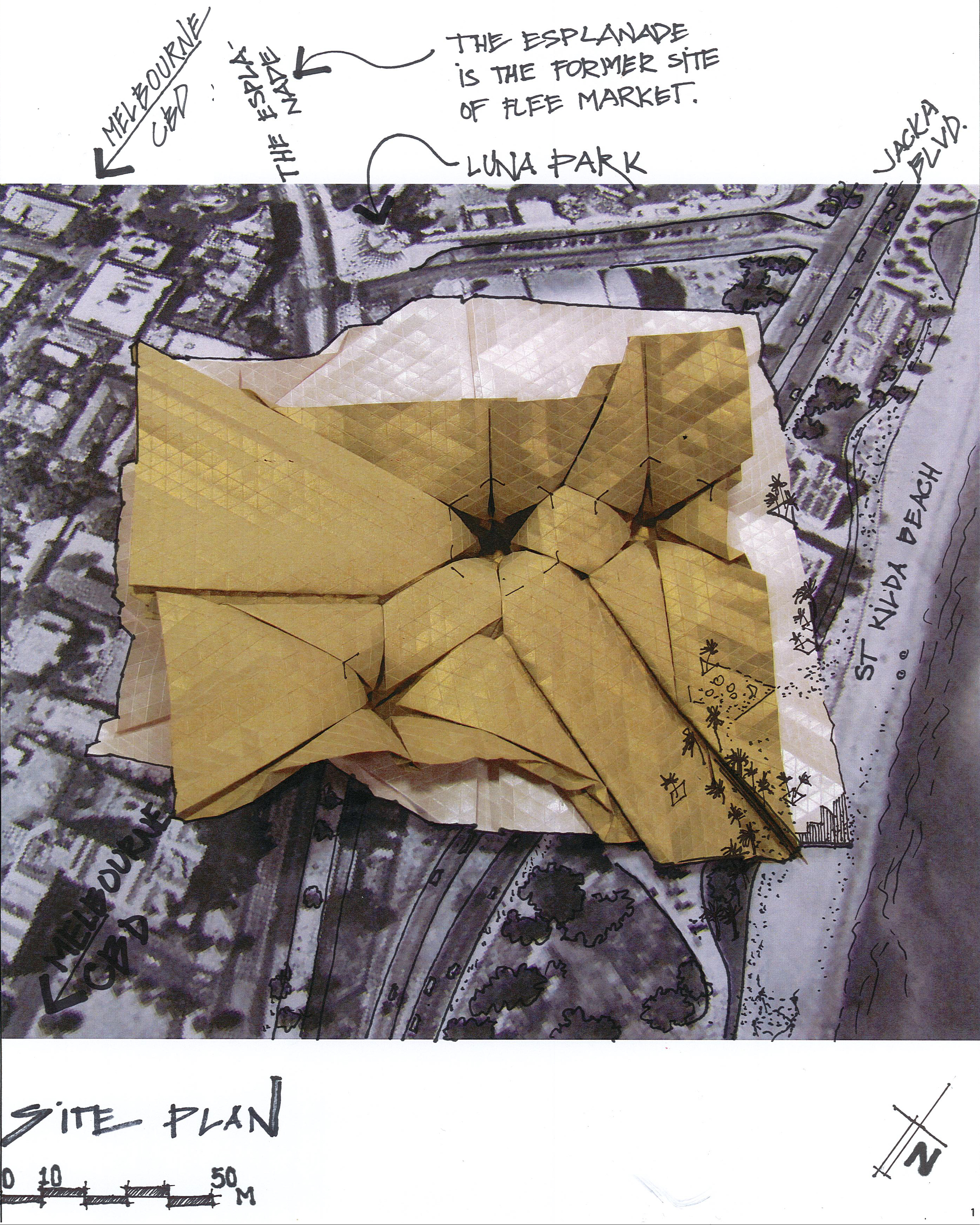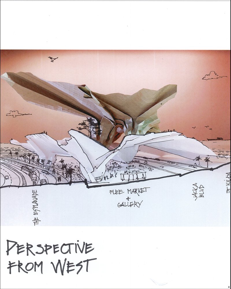 St Kilda Flea Market Place is proposed to be built in two floor levels with an area about one hectare. The project is intended to define the landscape while providing new amenities and covered areas which could be utilised for market and other public functions like temporary exhibitions or events. It is also intended to perform as a public space at other times and ultimately serve as a landmark in the area.