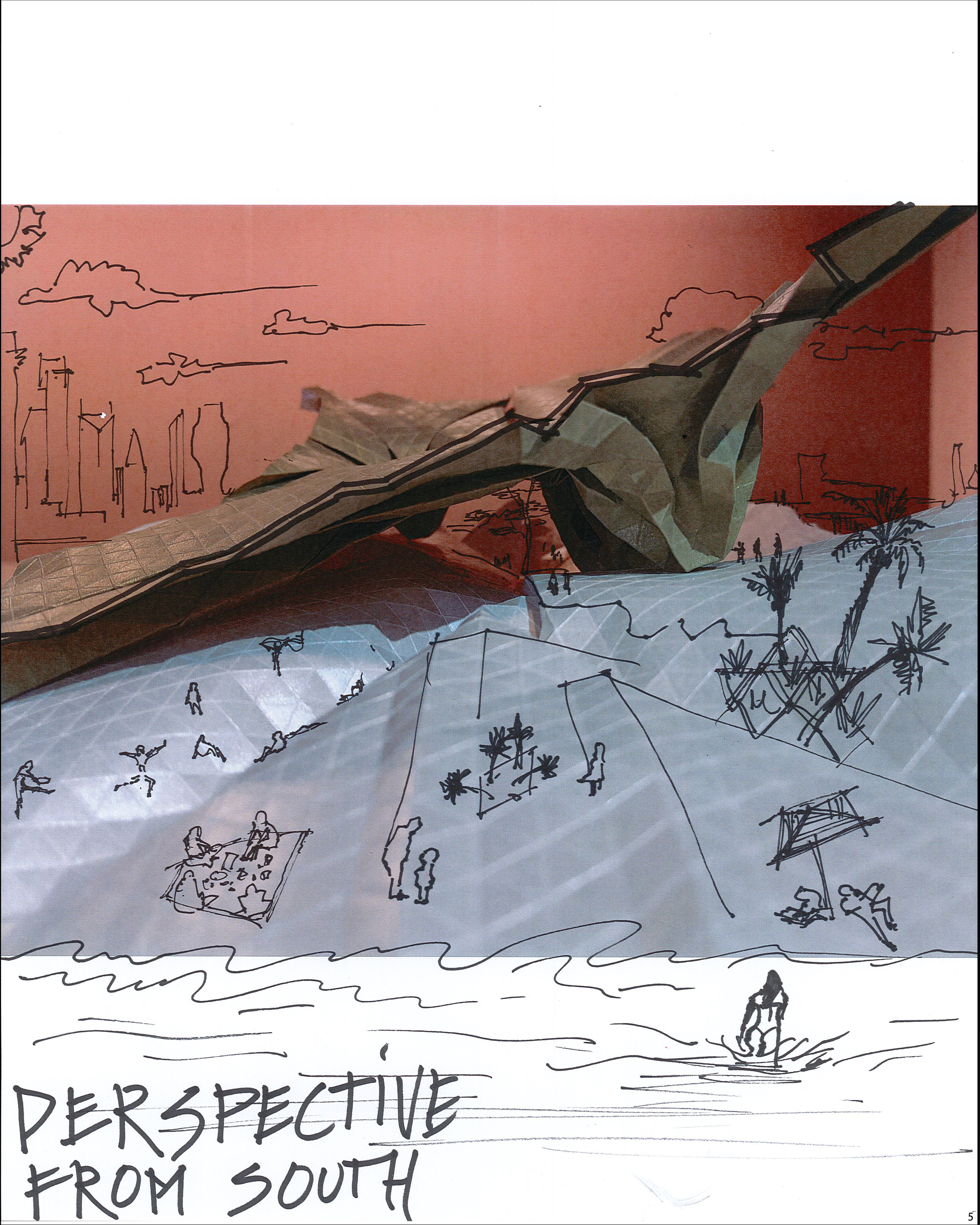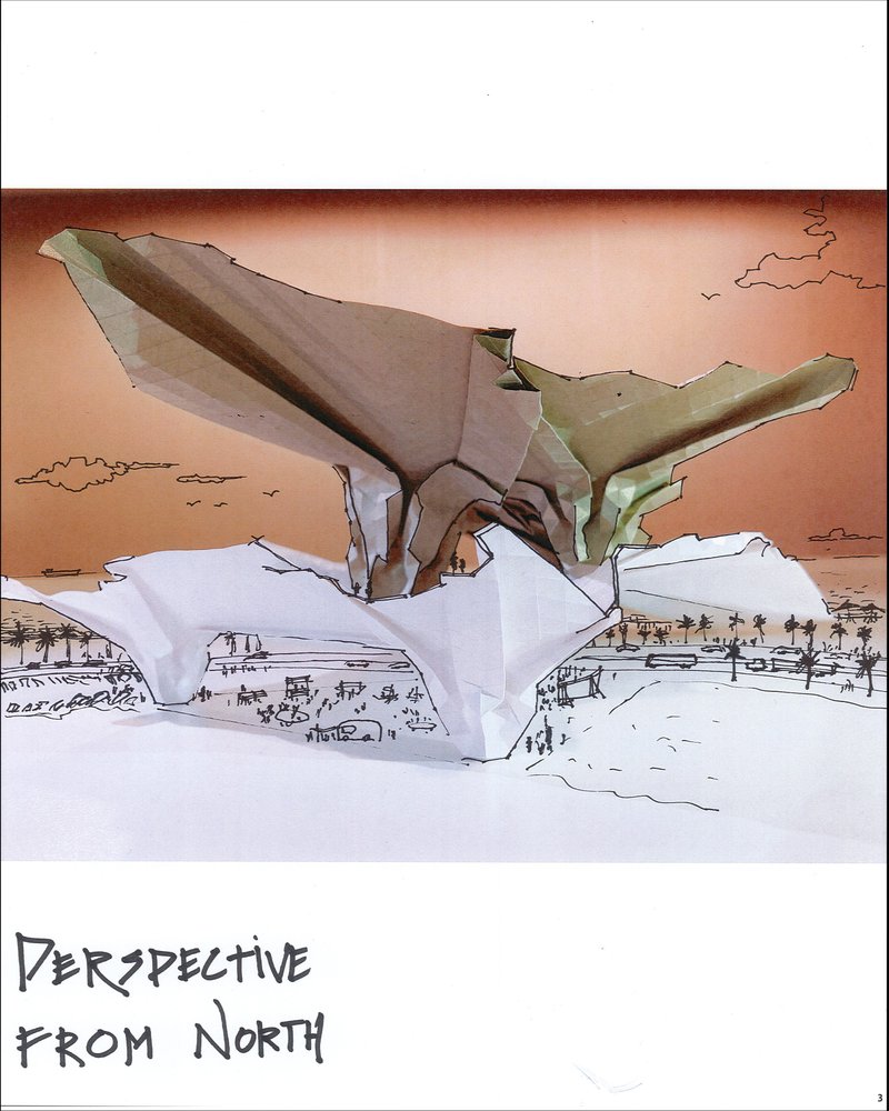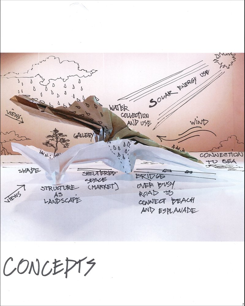 The flea market structure bridges over the beach road, creates a shelter and amenity, connects the urban context to the sea and frames the sky line. It is a landscape, it is a canopy, it is a shade and it is an outlook. It bends up from the ground. It bows down in front of the ocean. It has two intertwined floors, one arching over the road the second resembles a take off from the ground.