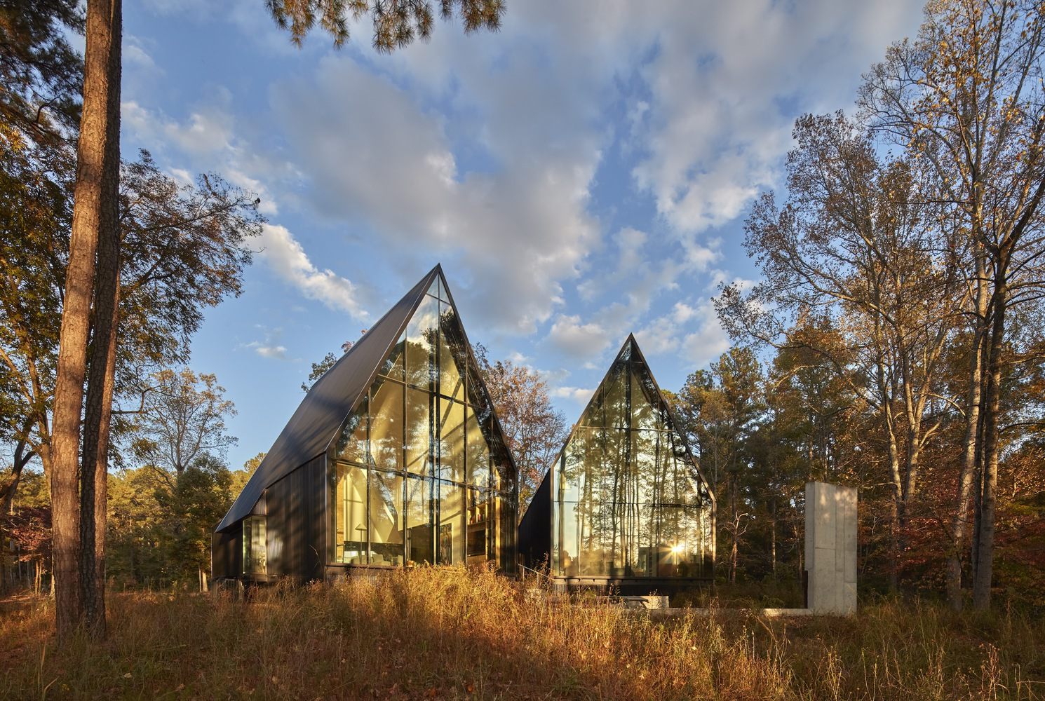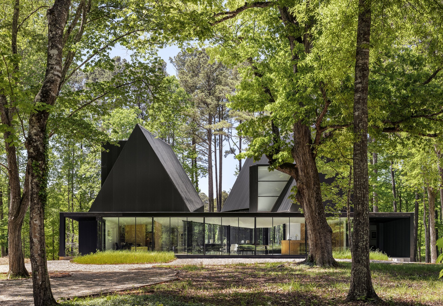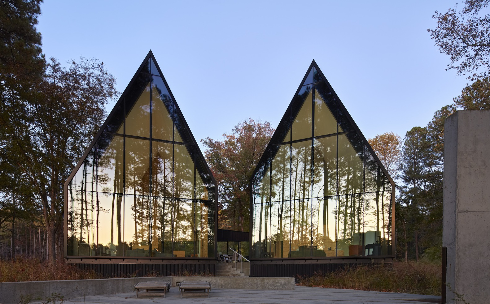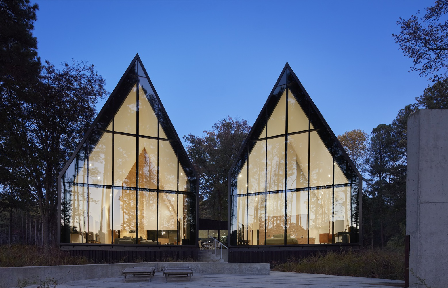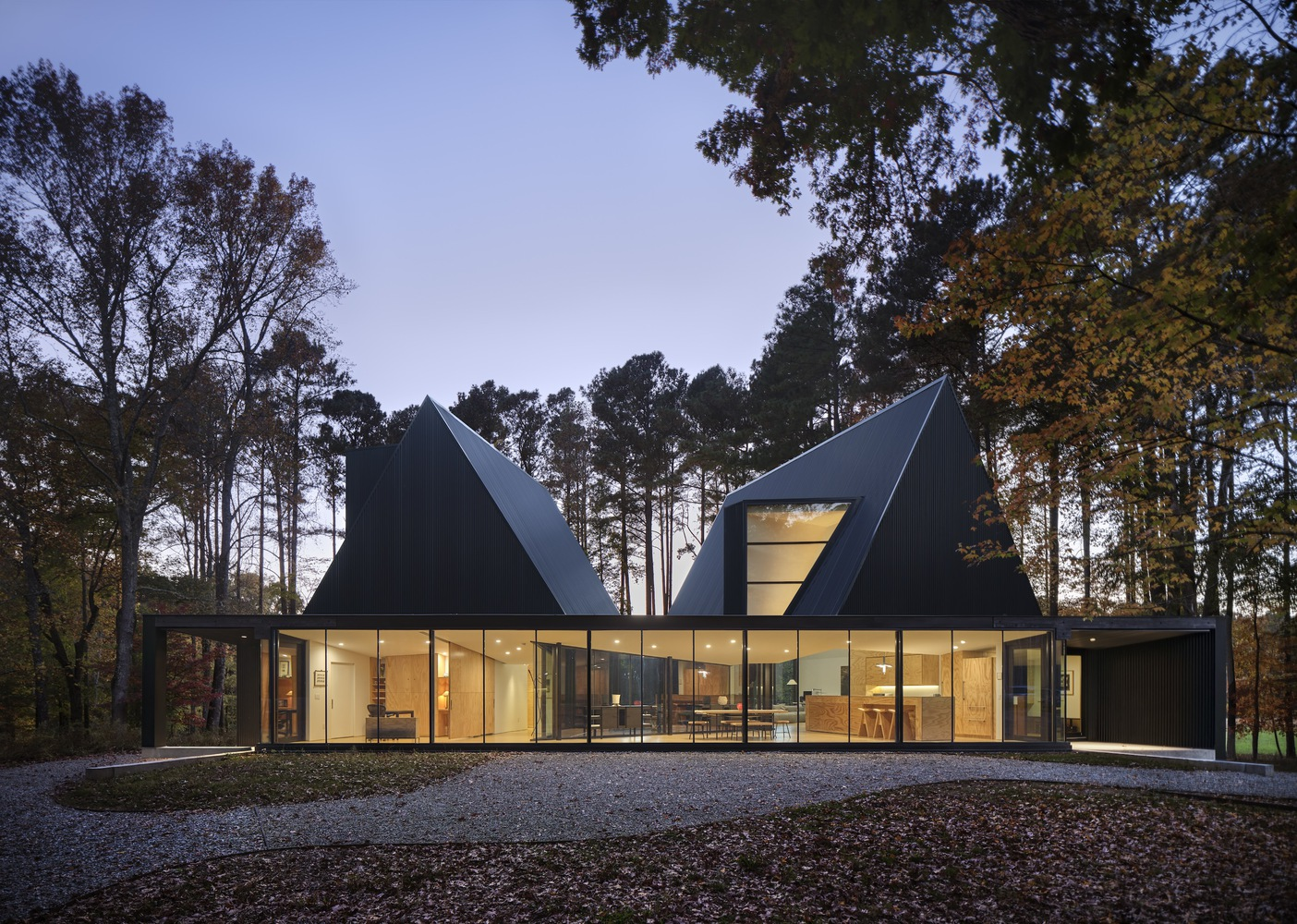 Steeplechase House was conceived as a sanctuary, a place of reflection and repose, drawing inspiration from the client's roots in Montreal. The home offers a tranquil retreat from the fast-paced life of Hollywood. Located near the Eno River, it is nestled amidst forests, reflecting the owners' desire to reconnect with nature.