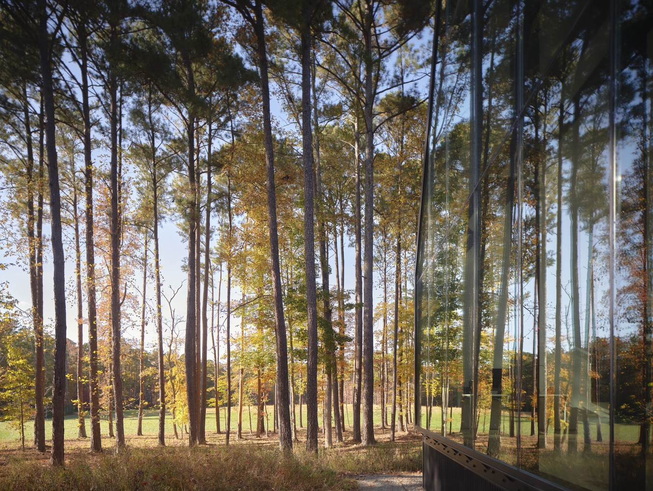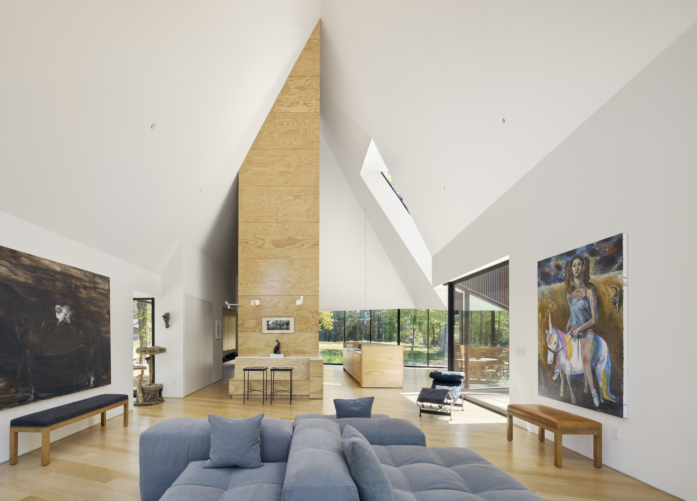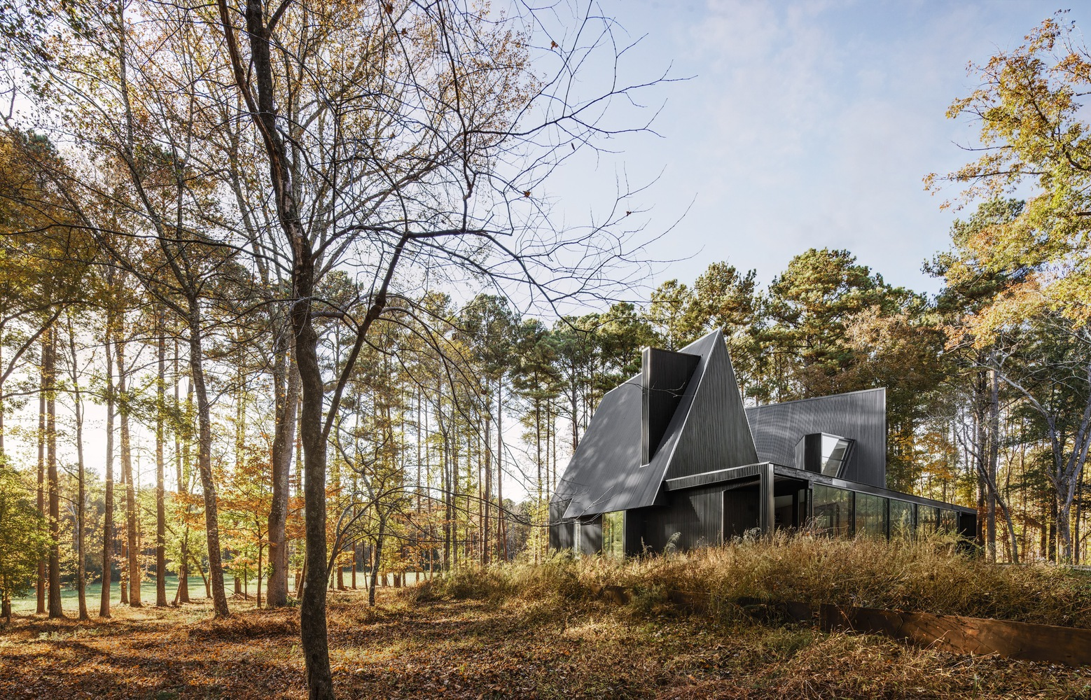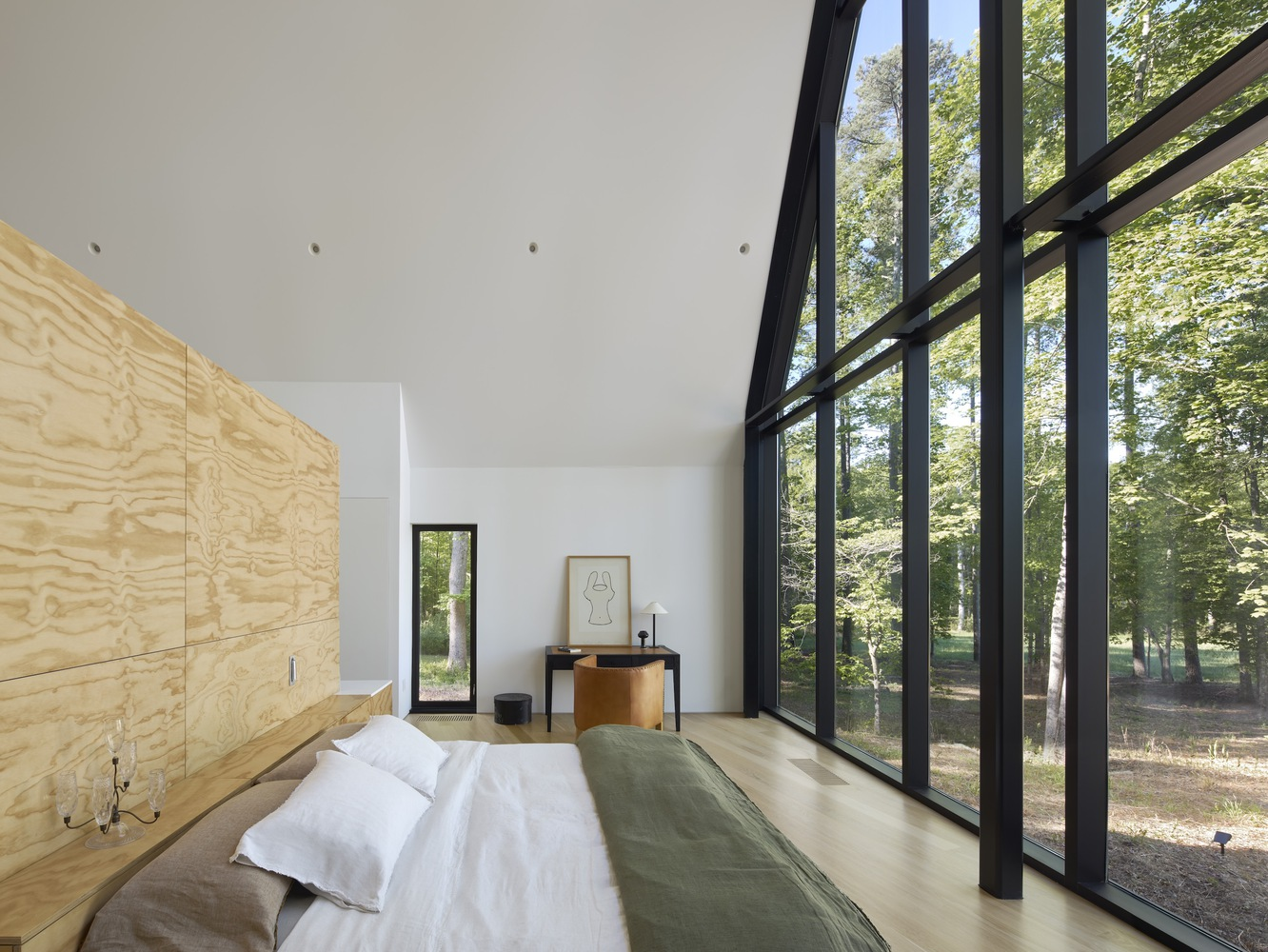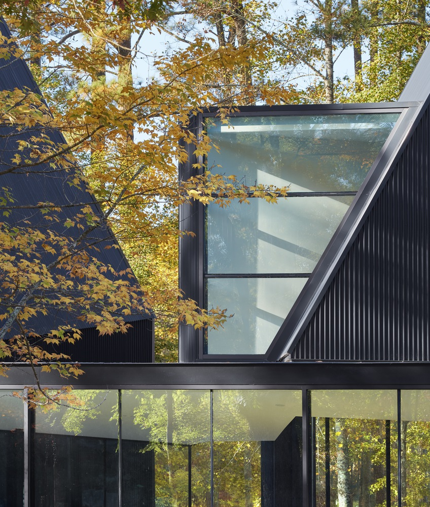 Steeplechase House was conceived as a sanctuary, a place of reflection and repose, drawing inspiration from the client's roots in Montreal. The home offers a tranquil retreat from the fast-paced life of Hollywood. Located near the Eno River, it is nestled amidst forests, reflecting the owners' desire to reconnect with nature.