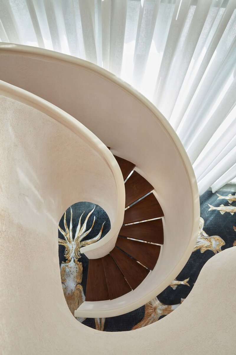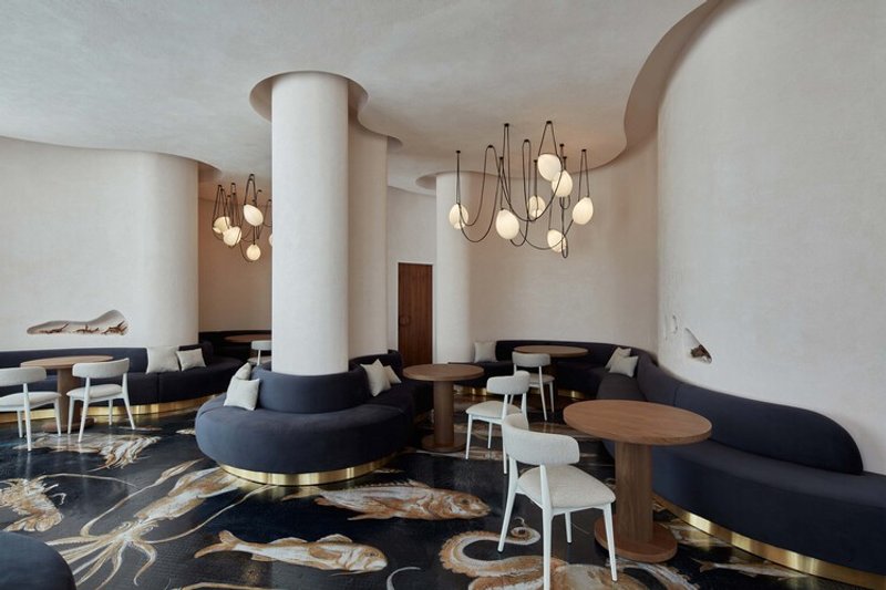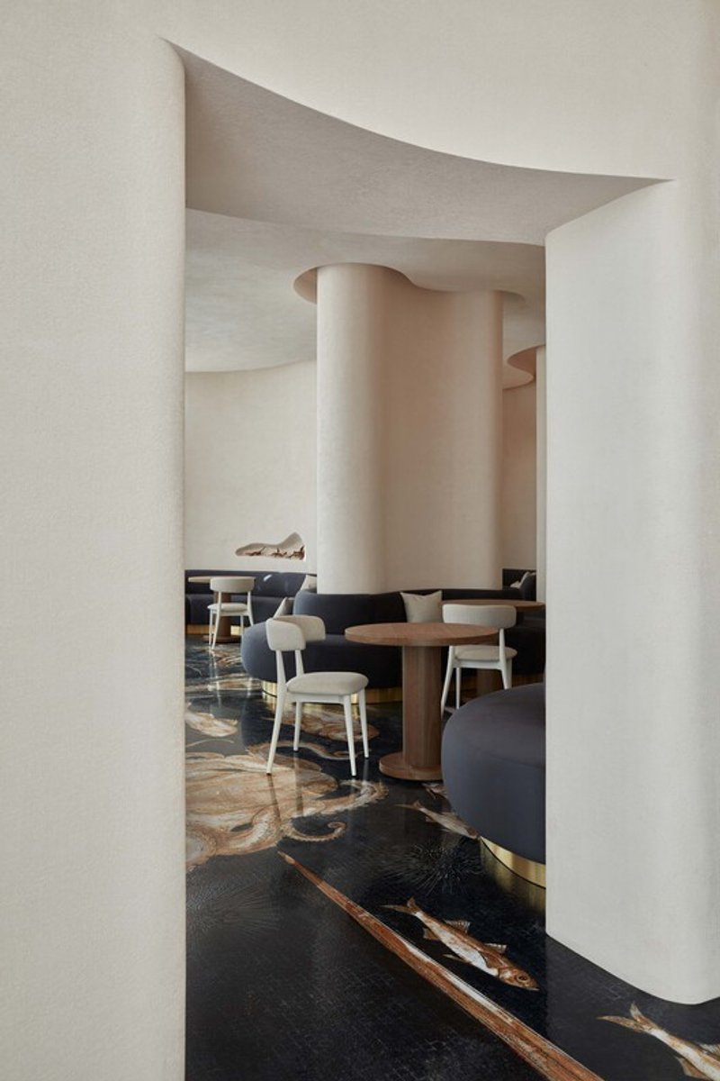 The interiors draw heavily from organic forms found in marine life and the movement of water surrounding coastal islands. Every curve and detail has been designed to mimic the fluidity of the ocean. The walls and floor are not straight or rigid but flow like currents, creating a space that feels alive and dynamic.