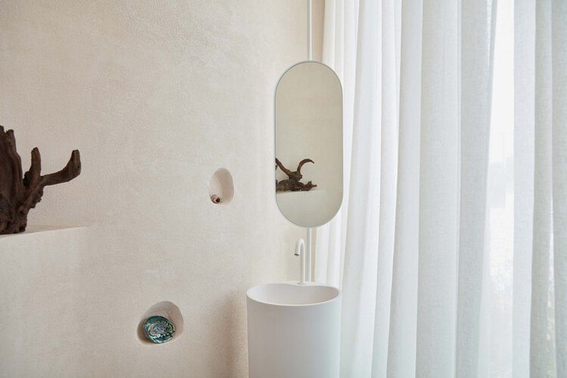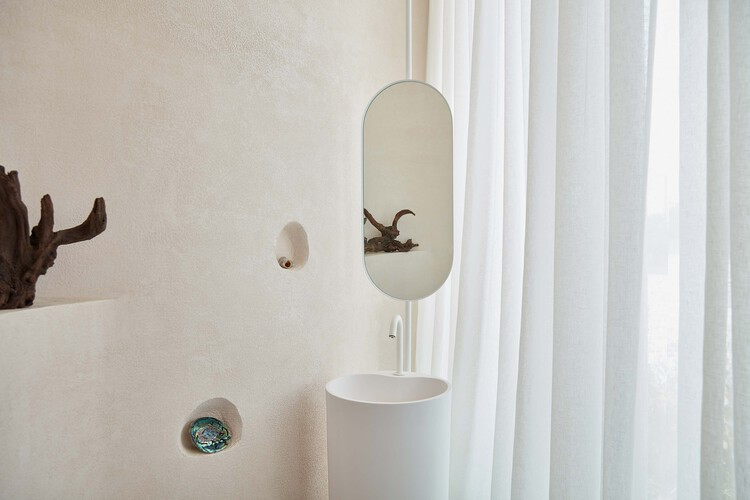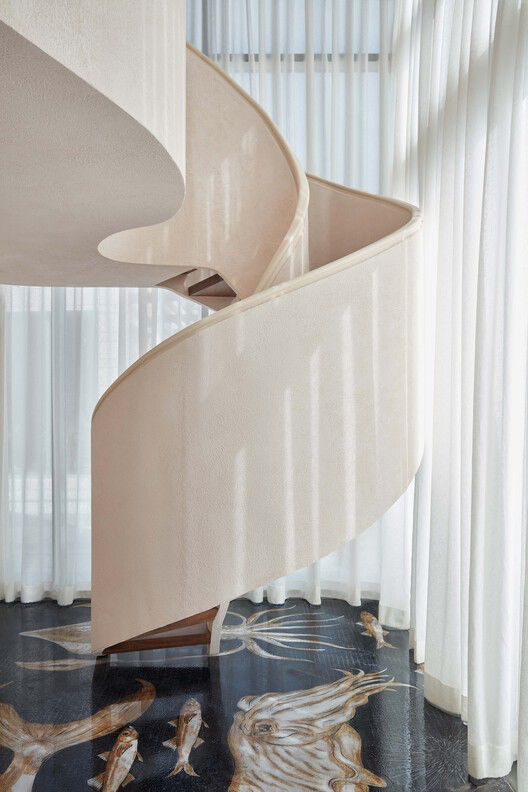 The floorplan itself was designed by tracing the movement of fish and water around the islands, creating a layout free of straight lines. Every wall was sketched directly on-site, making the space an architectural illustration of the sea.