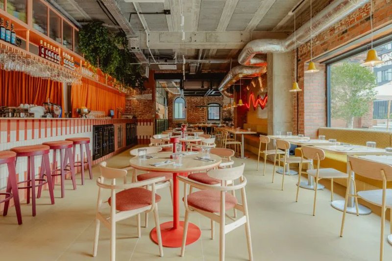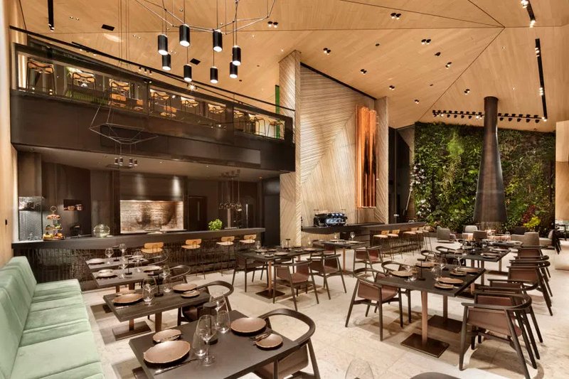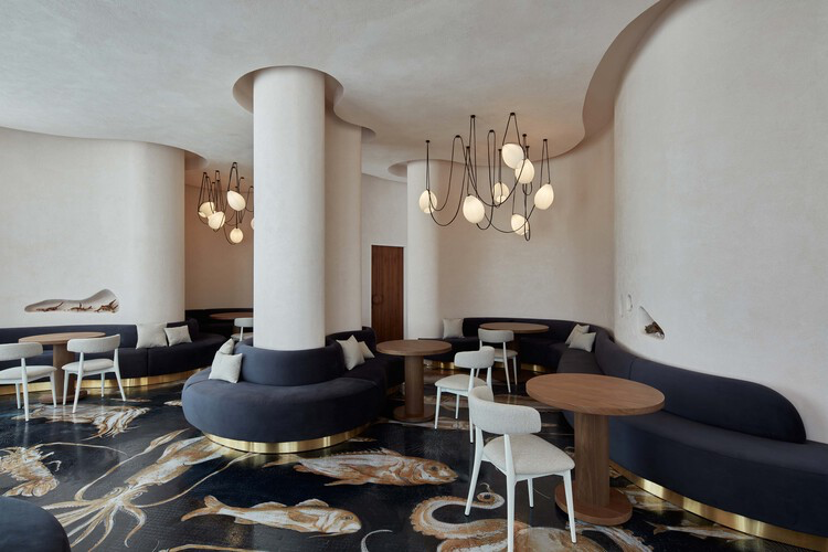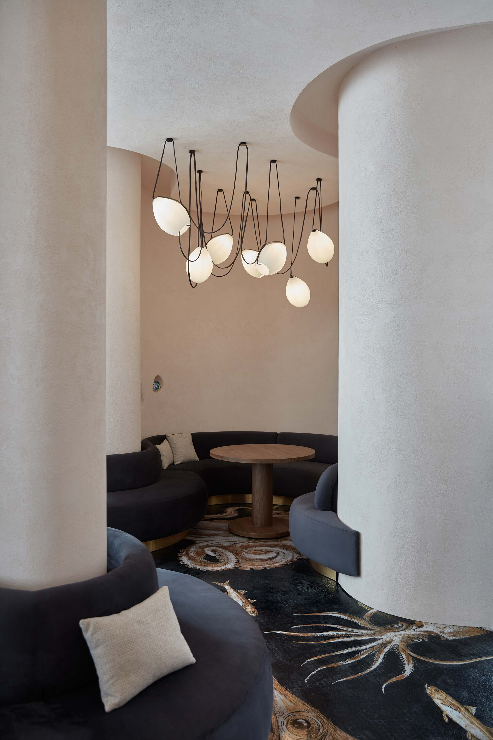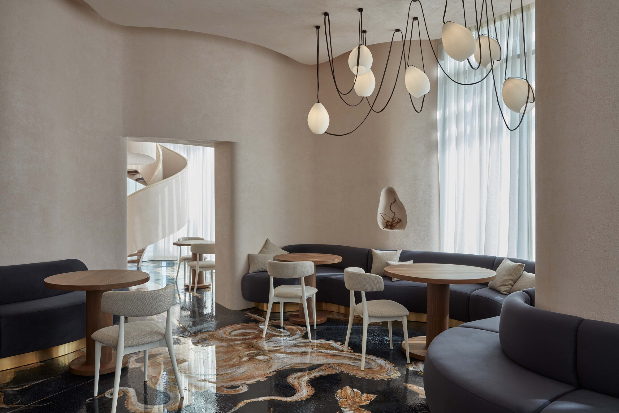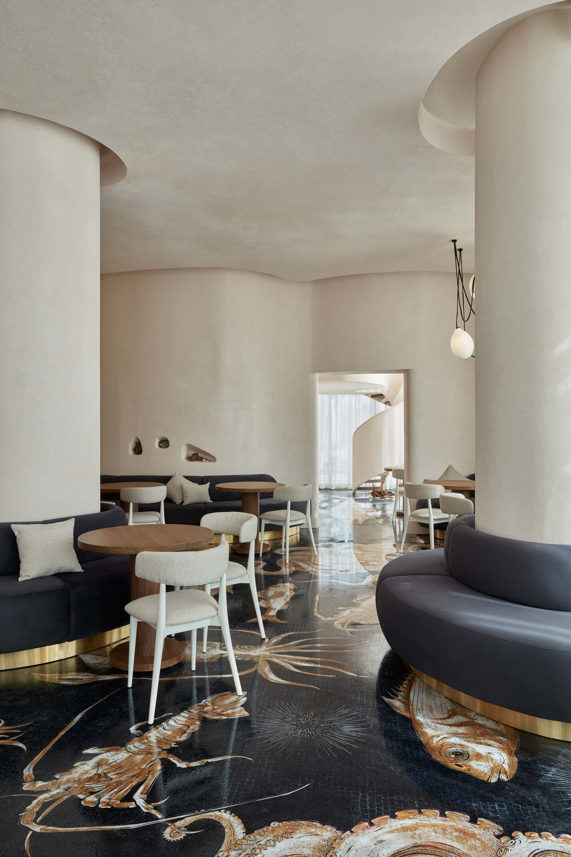 One of the most remarkable elements is the snaking, custom-made organic sofa, templated to fit closely against the curved walling. This seating creates intimacy while maintaining a fluid dialogue with the overall environment. The interior design ensures that guests feel both the comfort of a local gathering spot and the elegance of a high-end dining venue.