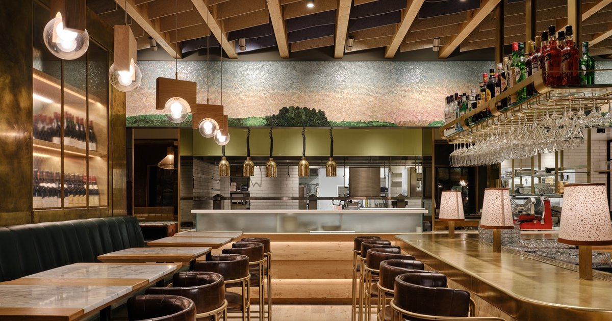 Ascending to the second floor, the bistro exudes sophistication with its butter-yellow tufted leather banquettes, cork-paneled walls, and a central bar designed to transition effortlessly from day to night. An intricate mosaic proscenium depicts a soft pink sunrise, setting the stage for a refined dining experience. The space combines openness and intimacy, allowing guests to engage with the kitchen while enjoying elevated cuisine.