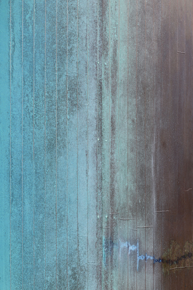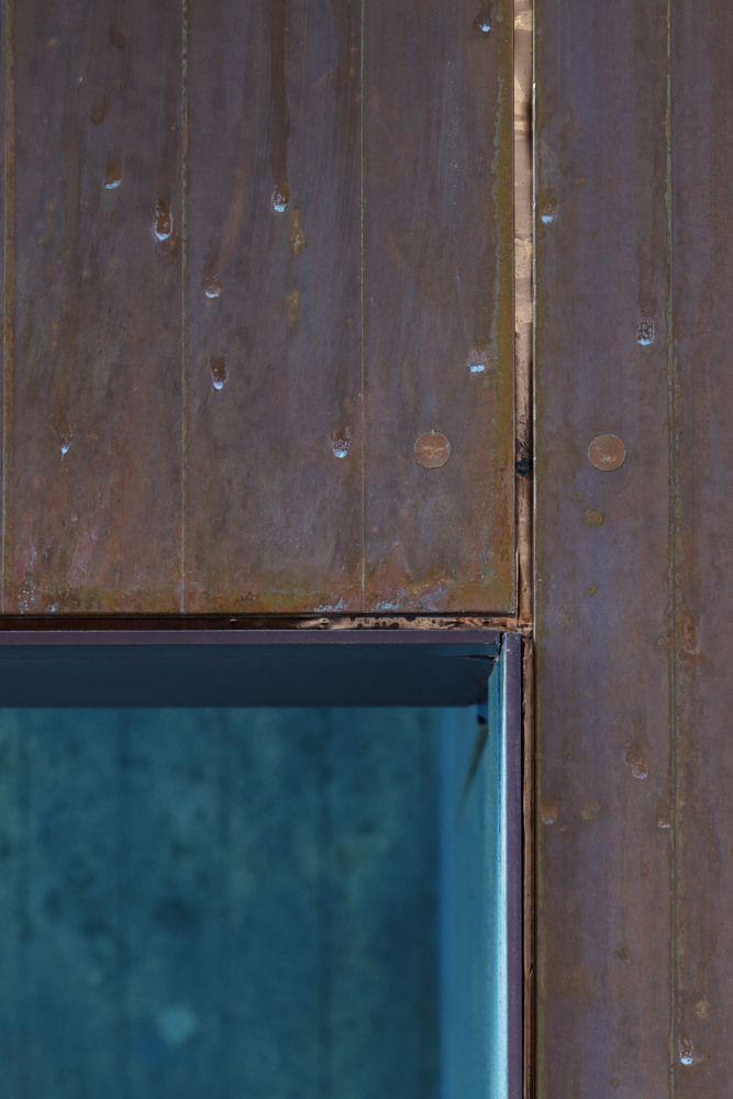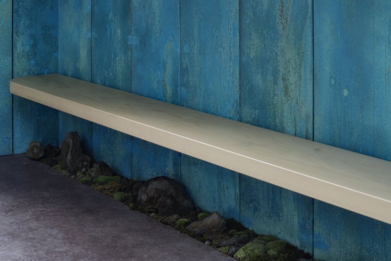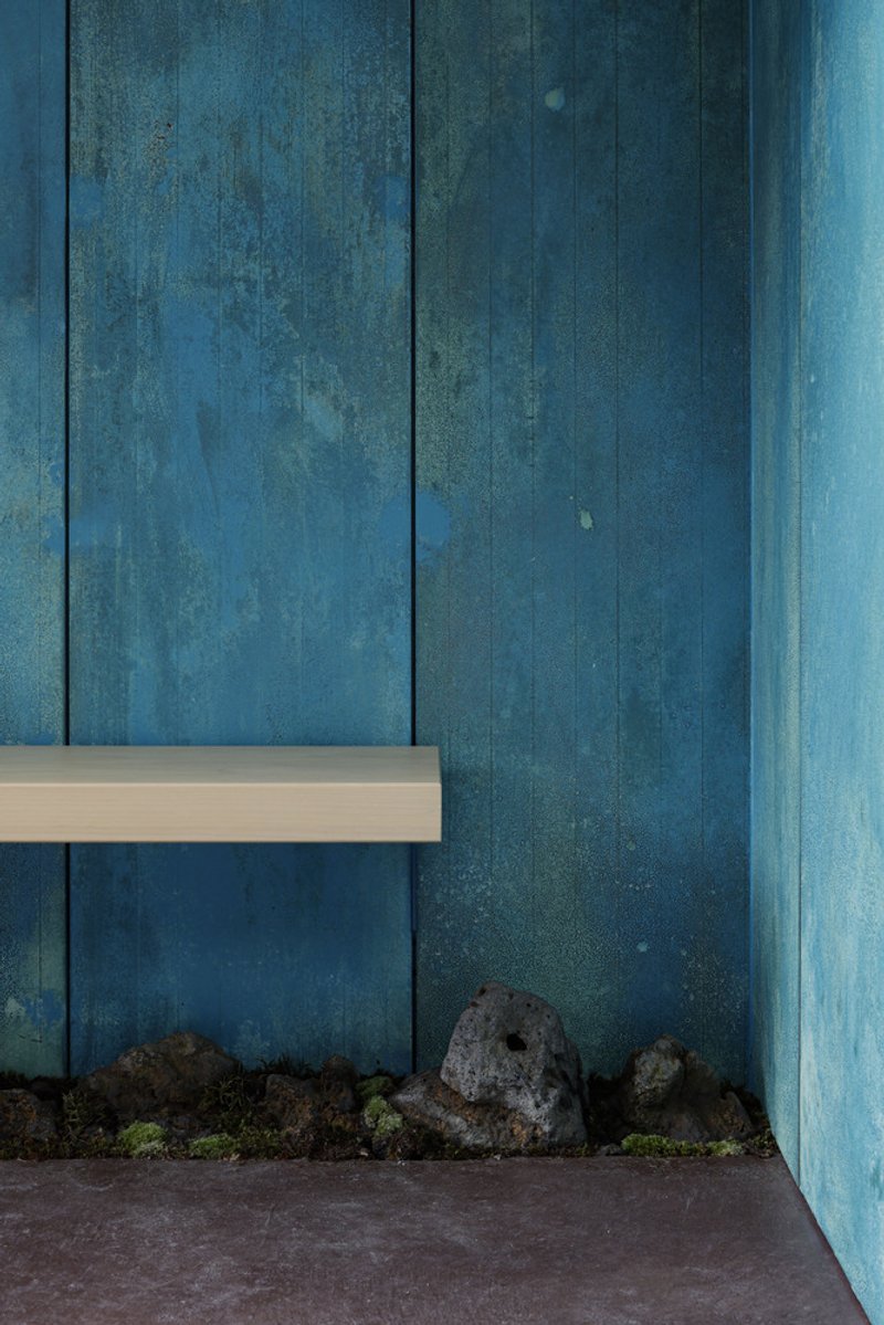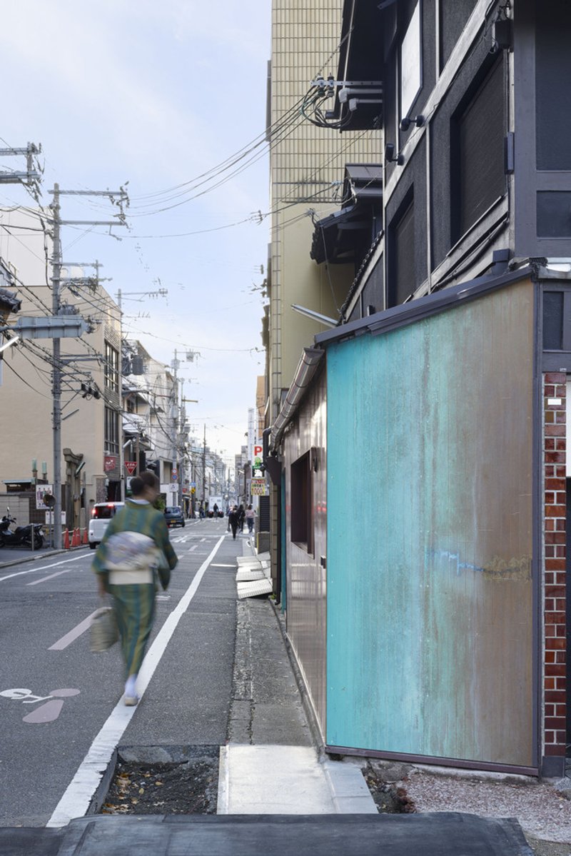 The cafe’s facade features copper panels treated through a unique chemical oxidation process that mirrors SUETOMI’s historic corporate color — “Suetomi Blue.” To achieve this, the architects applied copper foil to the walls and used soy sauce and ammonium chloride to accelerate oxidation, a technique inspired by traditional Japanese methods. The resulting patina develops hues ranging from warm reddish-browns to soft verdigris greens, all without paint, ensuring compliance with strict cityscape regulations that restrict exterior colors to natural materials.