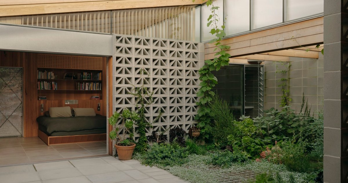 Clever architectural detailing ensures the home remains private without sacrificing light or openness. Obscured clerestory windows filter northern sunlight while shielding views of neighboring buildings. Breeze-block walls subtly separate functional zones while allowing glimpses and airflow, fostering a continuous spatial dialogue throughout the compact dwelling.
