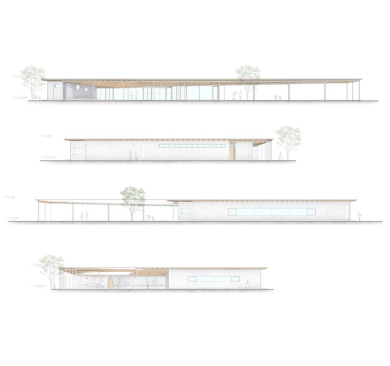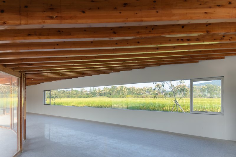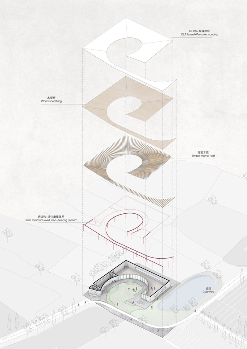 To enhance thermal performance, the insulation is embedded within the structural layer, allowing the wooden rafters' visual height to be uniformly reduced to 200mm. This not only improves energy efficiency but also preserves the building’s minimalist aesthetic, reinforcing its seamless integration with the landscape.