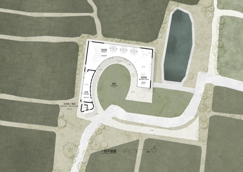 Positioned on an irregular site adjacent to a pond, the project navigates its fragmented landscape with an adaptive architectural strategy. The existing field ridges and farm roads divide the plot, creating natural boundaries that the design incorporates rather than resists. By embracing the pathways that cut through the land, the workshop becomes entangled with its surroundings, promoting a deeper connection between built and natural elements.