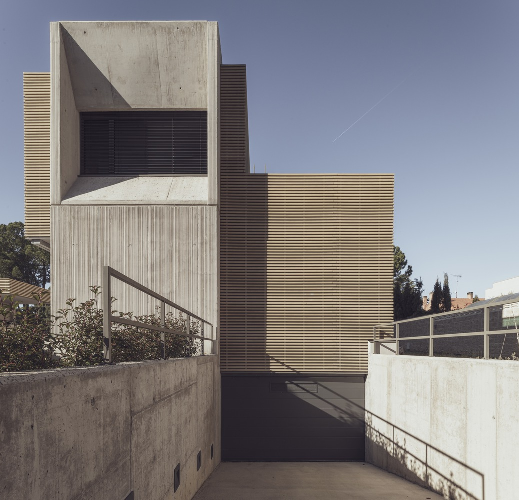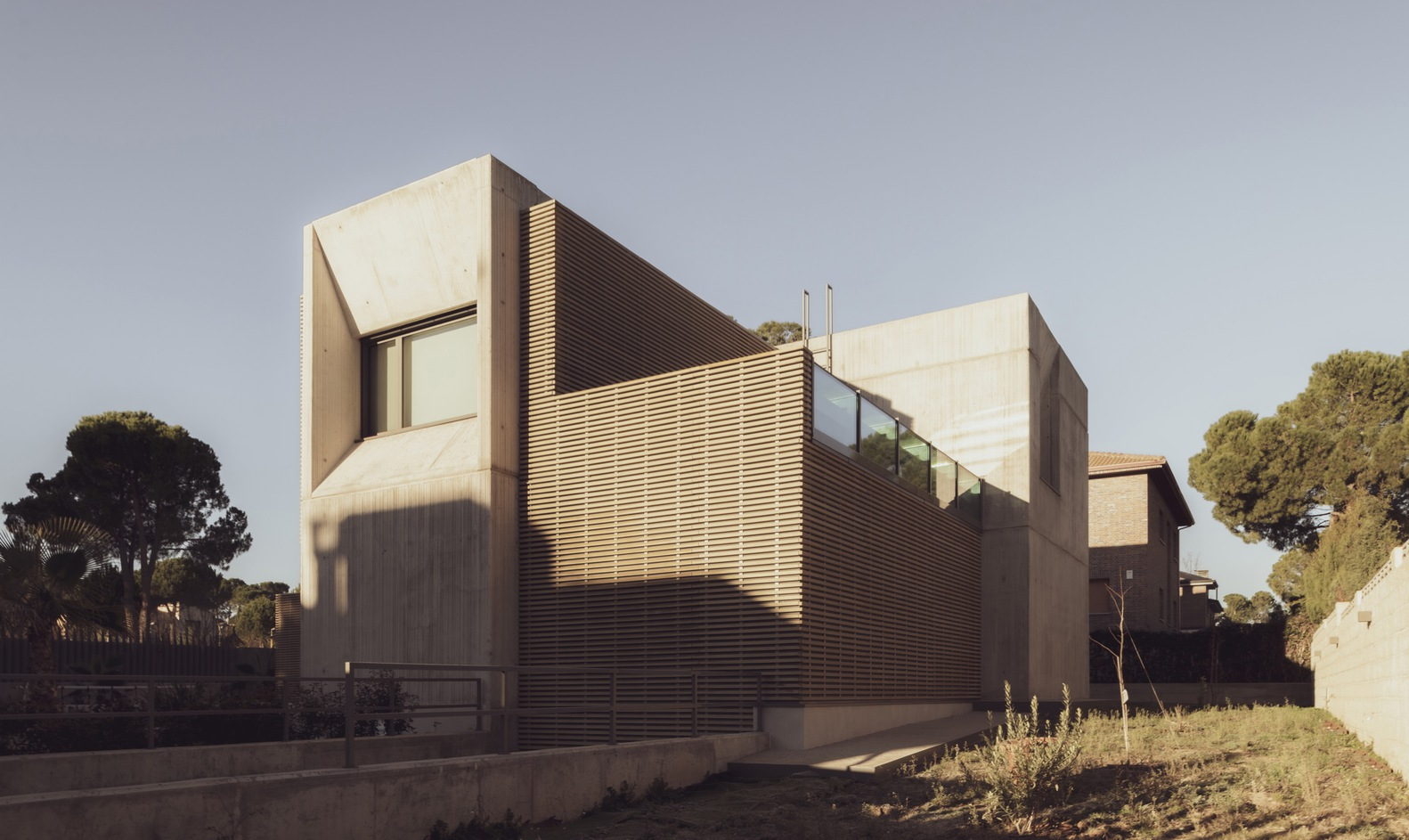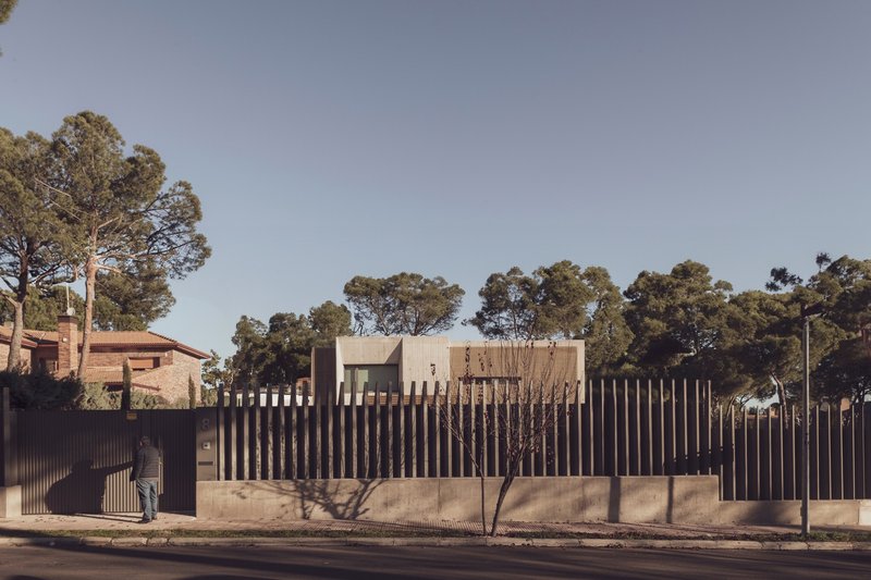 The house employs a dual construction approach: a heavy, stereotomic base of exposed reinforced concrete anchors the structure, enhancing its massiveness and thermal efficiency. In contrast, a tectonic upper section, light both visually and structurally, utilizes high-density insulation panels. This innovative combination not only reduces the building's environmental footprint but also exemplifies the principles of sustainable architecture in Madrid.