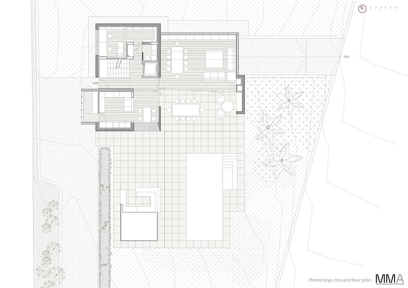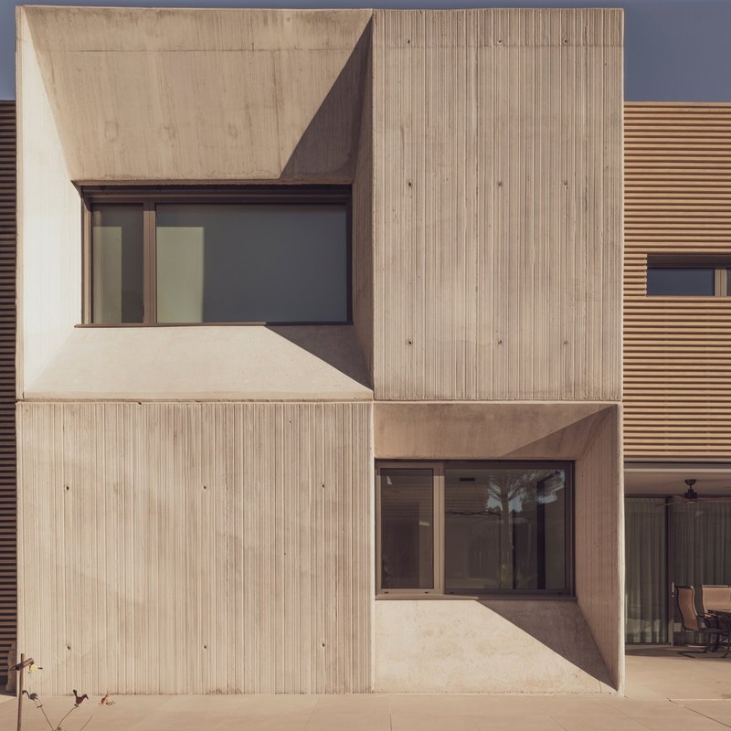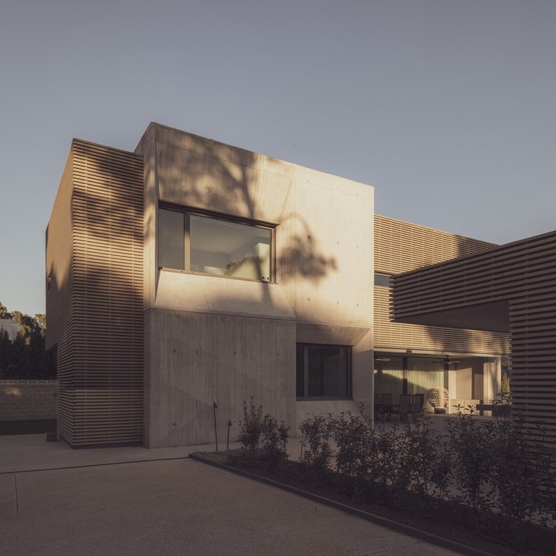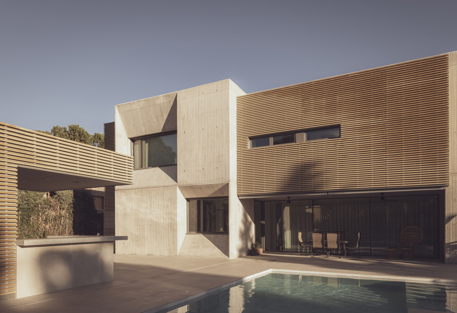 The house employs a dual construction approach: a heavy, stereotomic base of exposed reinforced concrete anchors the structure, enhancing its massiveness and thermal efficiency. In contrast, a tectonic upper section, light both visually and structurally, utilizes high-density insulation panels. This innovative combination not only reduces the building's environmental footprint but also exemplifies the principles of sustainable architecture in Madrid.