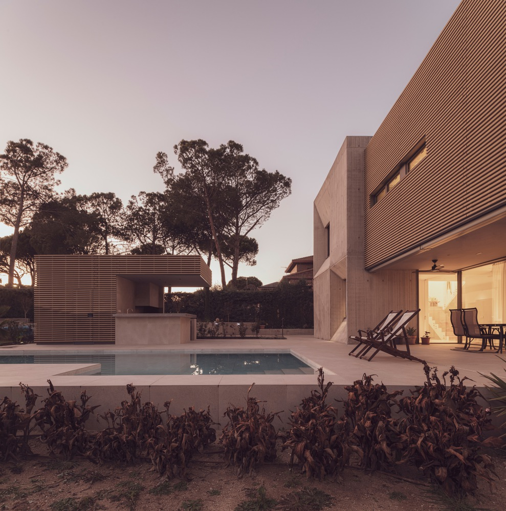 Silos 8 House stands as a beacon of sustainable architecture in Madrid, embodying a design ethos that values environmental harmony. The surrounding pine trees not only provide natural shelter but also contribute to the house's unique aesthetic, casting playful shadows that dance across its façade.