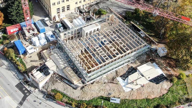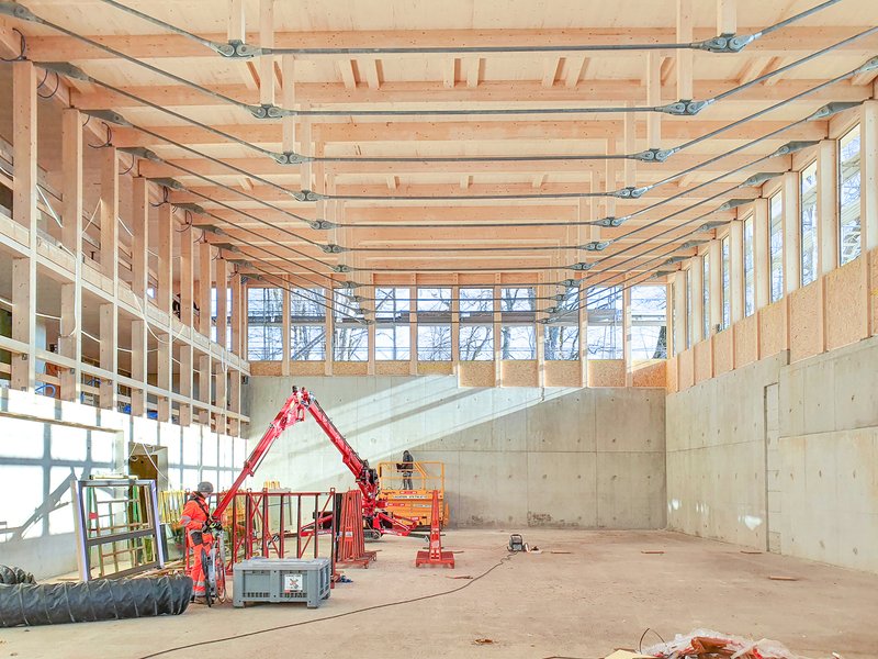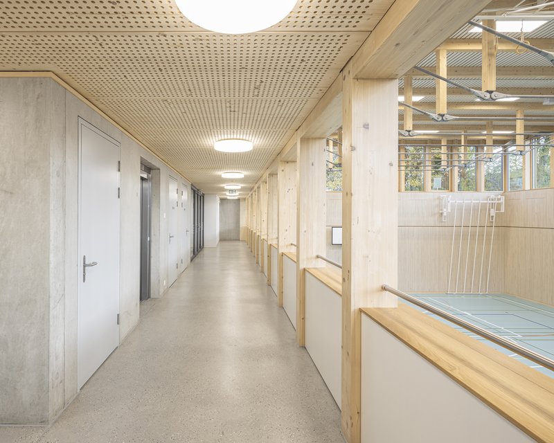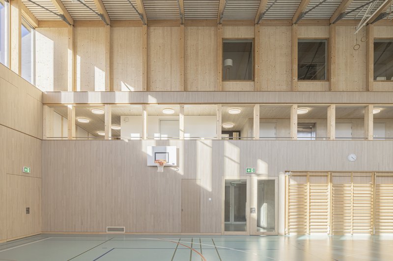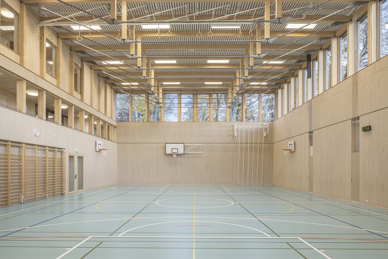 The Sainte-Croix Gymnasium stands as a dual-purpose building, designed to house both a sports hall and educational facilities. The design incorporates two distinct load-bearing systems: trapezoidal beams support the expansive sports hall, while solid wooden slabs create the structural framework for the additional facilities. This efficient approach maximizes the use of space and materials, ensuring that the building serves its intended purpose while maintaining a minimal environmental footprint.