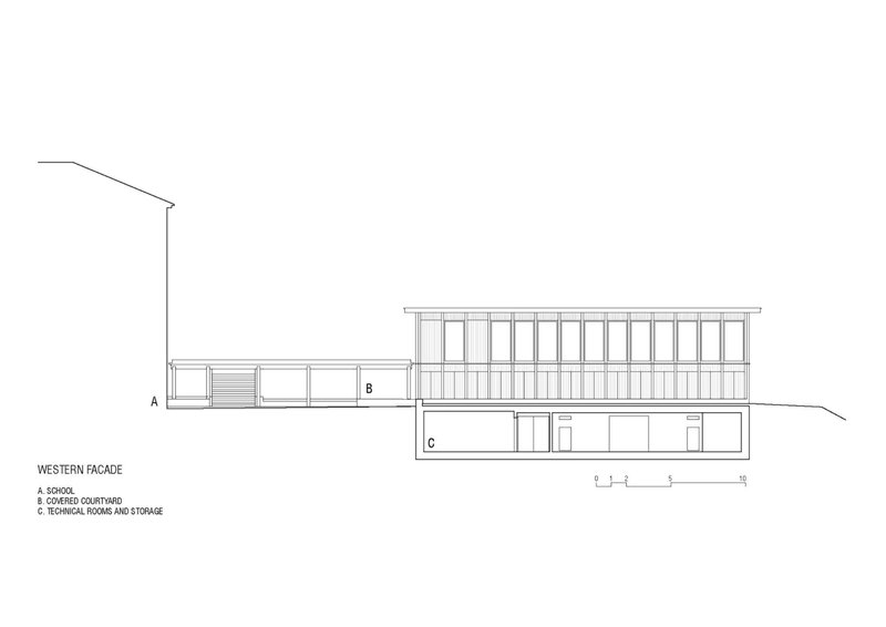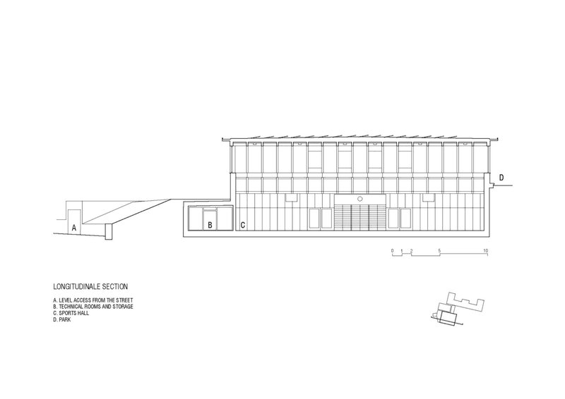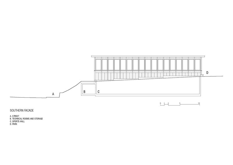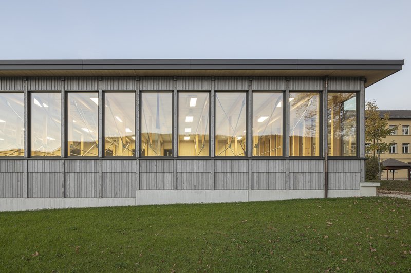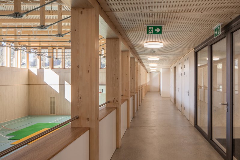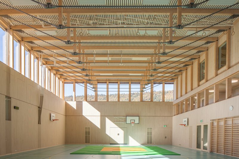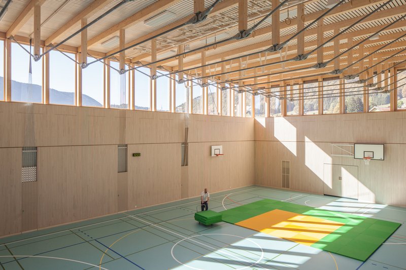 The gymnasium's design reflects a deep commitment to the preservation of the natural environment. Nestled between a school building and an adjacent garden that offers stunning views of the surrounding mountains, the structure makes efficient use of the constrained site. By maintaining a low profile and utilizing the natural slope of the terrain, the building minimizes its visual impact while enhancing the overall experience of the area. The use of local wood and natural materials further strengthens the connection to its natural context, ensuring that the gymnasium complements rather than competes with the existing landscape.